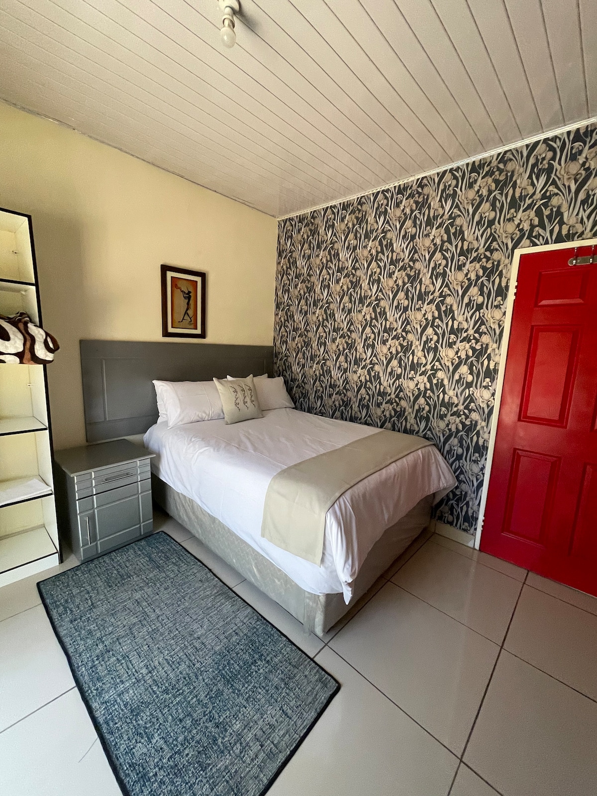 Escápate a un alojamiento en el sereno y frondoso barrio de Meyrick Park, Mabelreign. Esta vibrante casa moderna es perfecta para los viajeros que buscan descubrir Harare. La colorida sala de estar forma parte de un espacio de planta abierta y conduce a un patio con un gran jardín verde. La cocina de tamaño completo está totalmente equipada para cocinar para toda la familia. Con un respaldo solar, no te quedarás a oscuras durante los cortes de energía. El dormitorio principal incluye un amplio vestidor y un baño privado.
