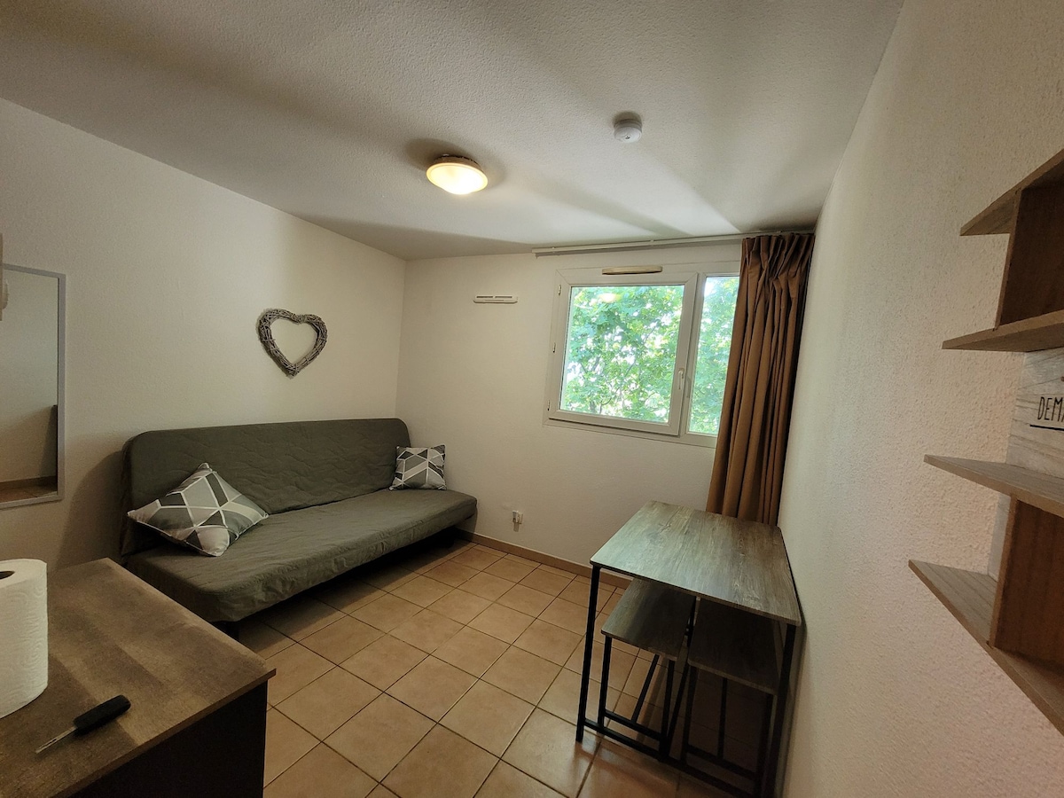 En parque privado cerca de Aviñón, en el sitio de Agroparc, estudio independiente para 2 personas con estacionamiento en nuestra residencia , 1 cama de 140cms, cómoda, armario, escritorio, cocina equipada y baño con ducha a ras de suelo, lavabo y WC. Acceso a Avignon en autobús N°4 al final de la calle (200m). El centro de exposiciones se puede llegar a pie, (500m). Parking cerrado en nuestro parque. terraza privada con mesa y sillas. piscina no climatizada. No hay instalaciones para bebés.