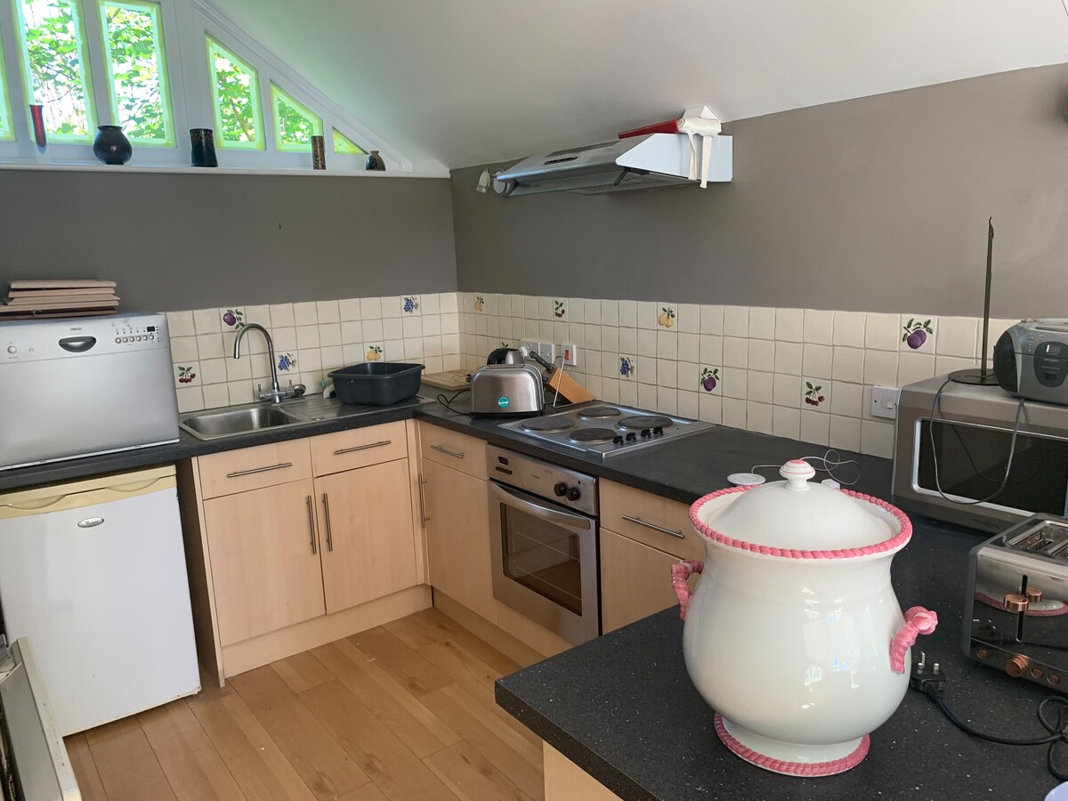 Acogedora habitación tipo estudio privada con baño privado, sala de estar y cocina. Esta encantadora habitación luminosa sobre nuestro garaje doble independiente está separada de la casa principal, lo que proporciona una mayor privacidad y relajación. Te proporcionaremos té y café, artículos de desayuno y ropa de cama limpia. La propiedad se encuentra en el codiciado pueblo de Kimington en East Devon, en la frontera de Dorset. El pueblo en sí tiene dos pubs, un garaje y la tienda Miller's Farm. También se encuentra junto a los bosques de Shute, con numerosos senderos para caminar.
