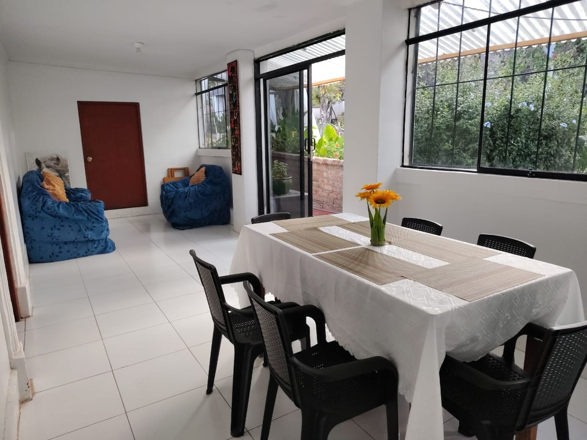 Casa familiar, es un lugar tranquilo, limpio y seguro con habitaciones aseguradas con tu propia llave. Ideal para estar con la familia o amigos. El alojamiento cuenta con una sala de TV de uso comun con Equipo de sonido, hay WIFI gratuito en toda la casa. Puede hacer uso de nuestras áreas sociales comunes sala de estar, sala de TV, cocina equipada, amplio comedor, lavandería, terraza, jardín. A 2 cuadras del mercado, lugares para comer y accesible.