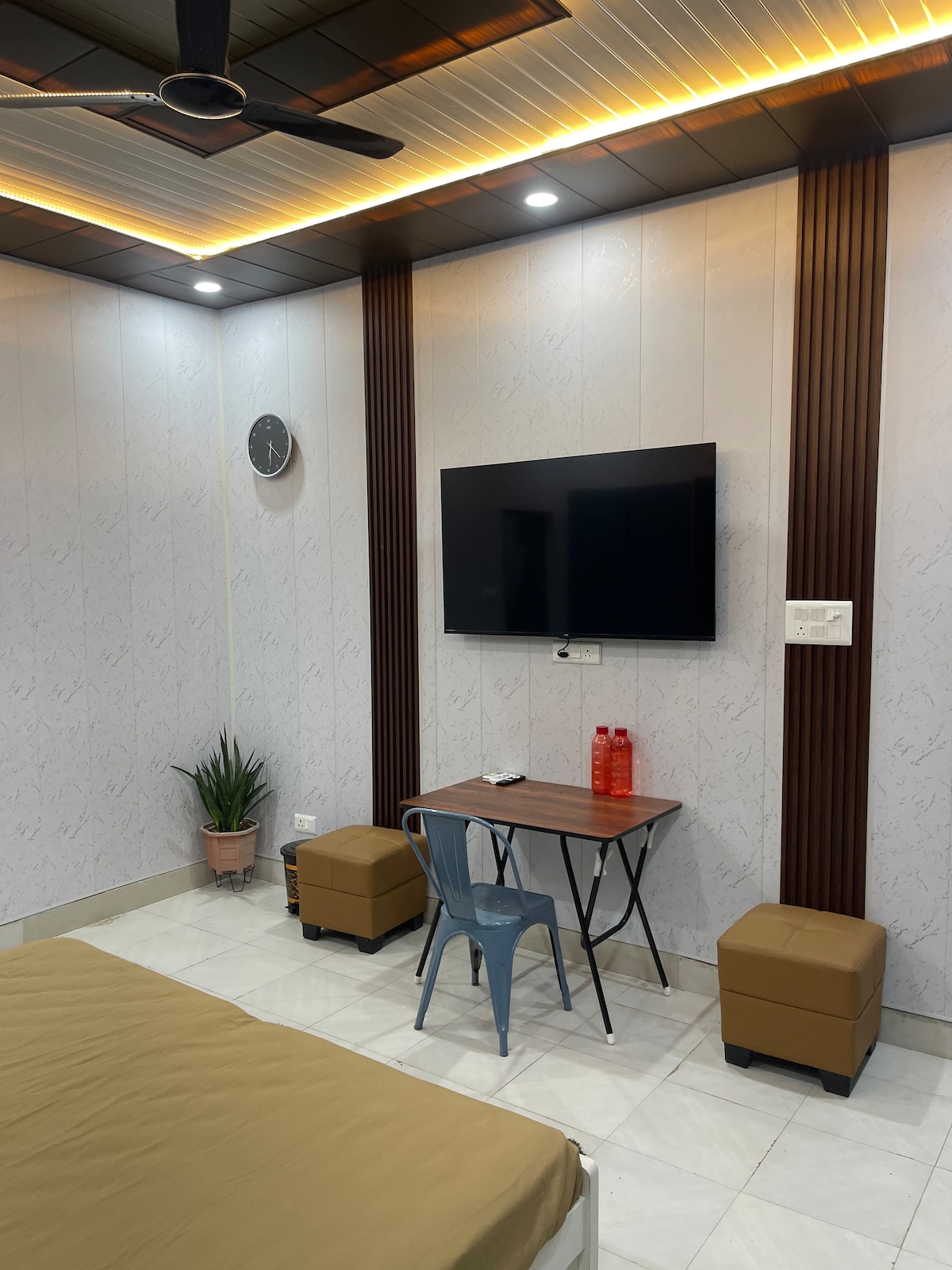 Entra en un luminoso apartamento de 1 BHK con una elegante sala de estar con techo de mármol, ventilador elegante e iluminación suave. Las sillas de terciopelo rojo y una mesa de mármol oscuro ofrecen asientos acogedores, mientras que las cortinas azul marino y crema aportan luz natural. Disfruta de una configuración de TV inteligente, una decoración elegante y una cocina totalmente equipada para cocinar cómodamente. El dormitorio conectado agrega comodidad, haciendo de este espacio moderno ideal para estancias de trabajo y de ocio.