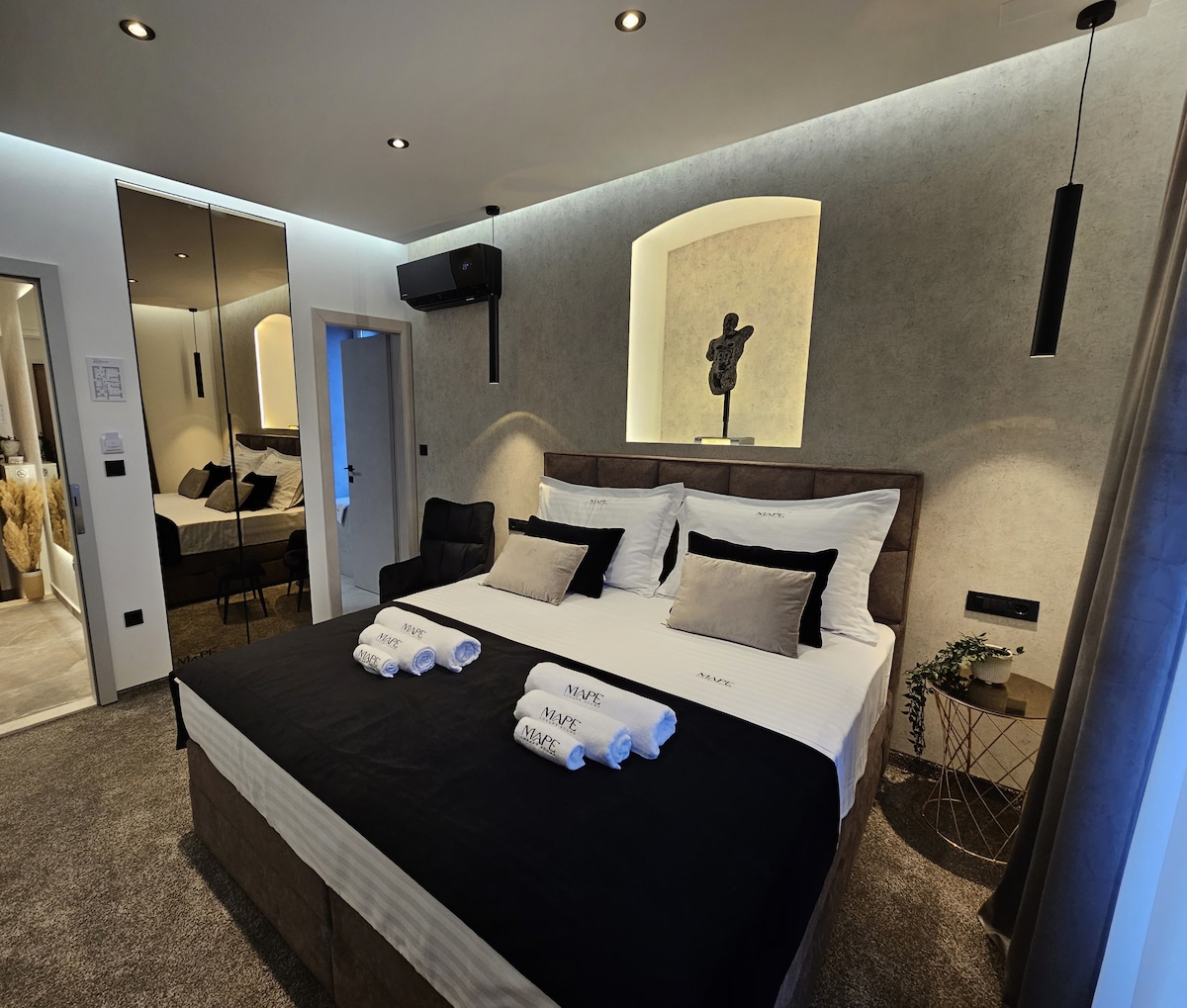 Esta habitación está climatizada, equipada con TV inteligente, WiFi gratuita, caja de seguridad y cerradura electrónica. También encontrarás un hervidor electrónico, una máquina de café nespresso y una nevera con algunos artículos de cortesía. Si visitas Dream Luxury Habitaciones durante el invierno, o si simplemente no te gustan los pies fríos, cada uno de nuestros baños está equipado con calefacción por suelo radiante. La parte especial de esta habitación es la vista a la ciudad ( vista al puerto de ferris y al parque Marjan).