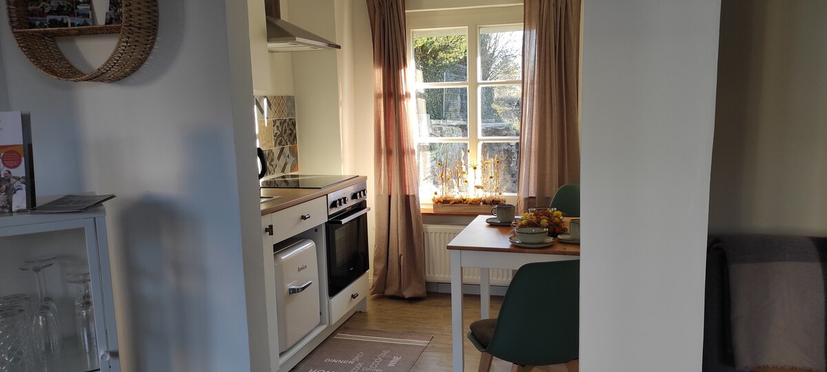 El apartamento de unos 30 metros cuadrados se encuentra en la casa de entramado histórica protegida, en el extremo oeste de Bad Bentheim. Es minimalista, moderno, está amueblado de forma acogedora y tiene una entrada independiente. ¡Una verdadera joya! En las inmediaciones se encuentra el viñedo Bentheimer. Un terreno natural, de libre acceso, que invita a quedarse. El casco antiguo histórico con el castillo de Bentheim está a poca distancia a pie.