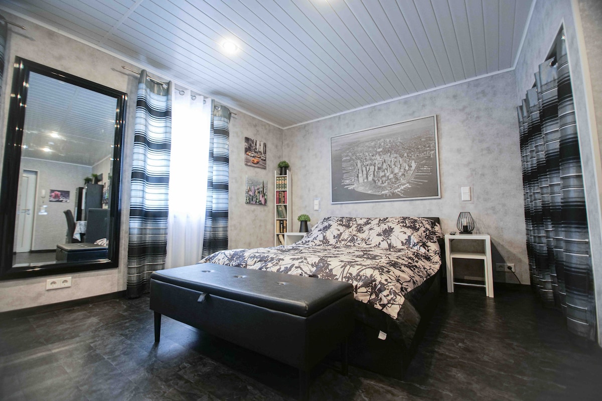 Acogedor apartamento de una habitación con cocina y baño. En el dormitorio - sala de estar hay un escritorio grande, una cama individual, otra cama supletoria se puede reservar por 5,-€ la noche. También hay un televisor y un sillón. La cocina está equipada con nevera, microondas, cafetera, hervidor de agua y 2 fogones. Hay suficientes tazas, platos, etc., además de una pequeña mesa de comedor y dos sillas. En el baño con ventana hay un inodoro, un lavabo y una bañera. Hay aparcamiento gratuito delante del apartamento. La entrega de llaves se realiza en el apartamento. A pie se encuentra la WHU en apenas 10 minutos y el centro de la ciudad en cinco minutos. La casa se encuentra a unos 50 metros del Rheinsteig y de Schönstadt.