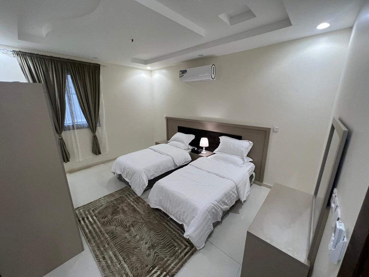 Descansa y acomódate en esta suite de dos dormitorios con baños privados y un salón abierto con una cocina de diseño de hotel europeo Solo tiene capacidad para 4 personas. Familias Entrada independiente con tu propio número privado Audio completo en todas las habitaciones Wattlalah Panorama Completo Muebles Ultra vip Hay una cocina amueblada, lavadora automática, microondas, plancha y gas. Es totalmente independiente. La ubicación del Bergdan Center es la ciudad de Al-Baha en medio de los parques de esta residencia de campo.