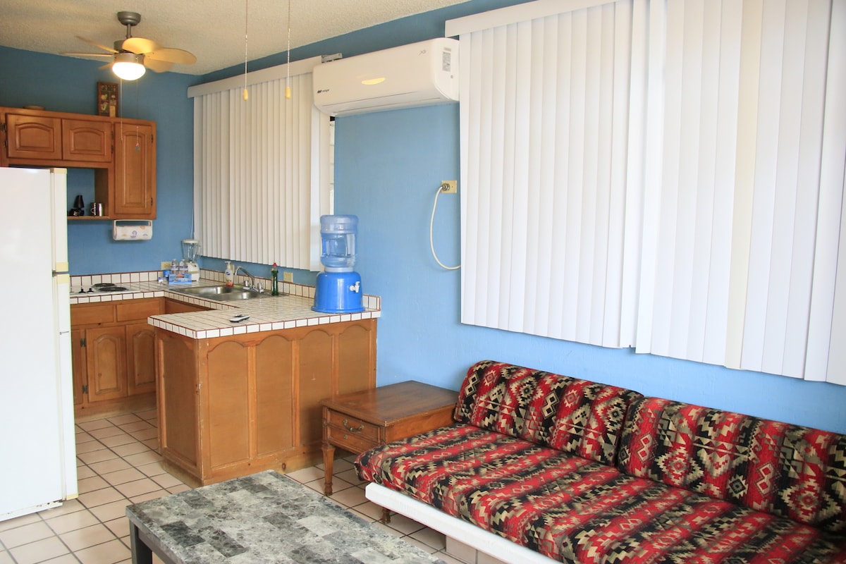 Cali 's Baja Condos Unit 1 es un hermoso y limpio dormitorio que puede alojar cómodamente hasta 4 huéspedes. La cocina totalmente equipada con sala de estar abierta tiene un sofá en forma de L que se convierte en 2 camas individuales. Ideal para parejas, viajeros solitarios o familias pequeñas. La unidad es una de las tres en un complejo cerrado. Acceso a la piscina, barbacoas (carbón vegetal y propano), varios patios, incluida una palapa en la azotea con vistas de 360° de las montañas y el mar de Cortés. Incluye wifi y aire acondicionado.