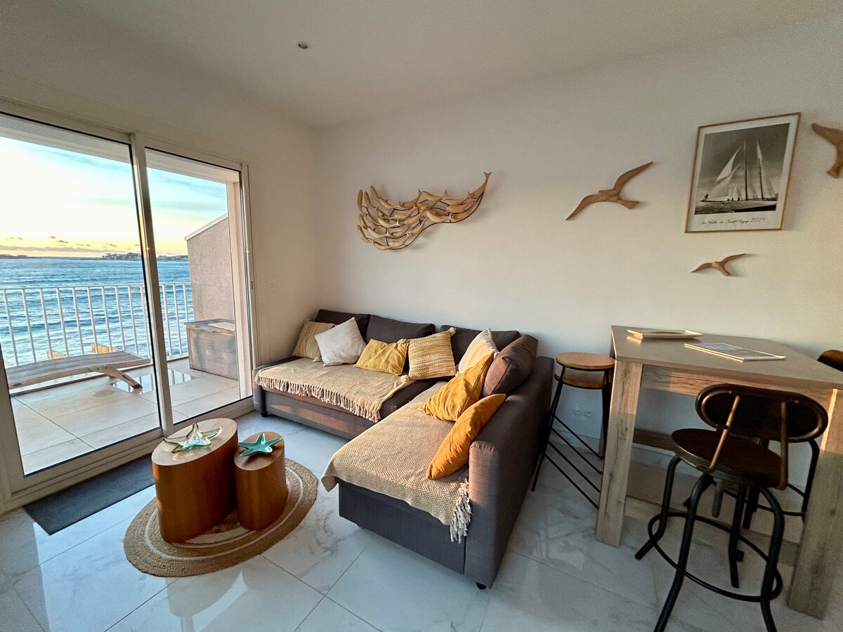 Disfrute de la magia de la Navidad en Sanary Sanary, encantador apartamento de 2 habitaciones amueblado en primera línea de mar, de 32 m² con terraza de 25 m², vistas panorámicas al mar. Tranquilo. Completamente renovado con materiales de calidad, se puede admirar la bahía de Bandol, contemplar las puestas de sol. A igual distancia del centro de Bandol y Sanary, Podrá disfrutar del Casino de Bandol o del mercado de Sanary y de su pequeño puerto pintoresco. Aparcamiento privado dentro de la residencia.