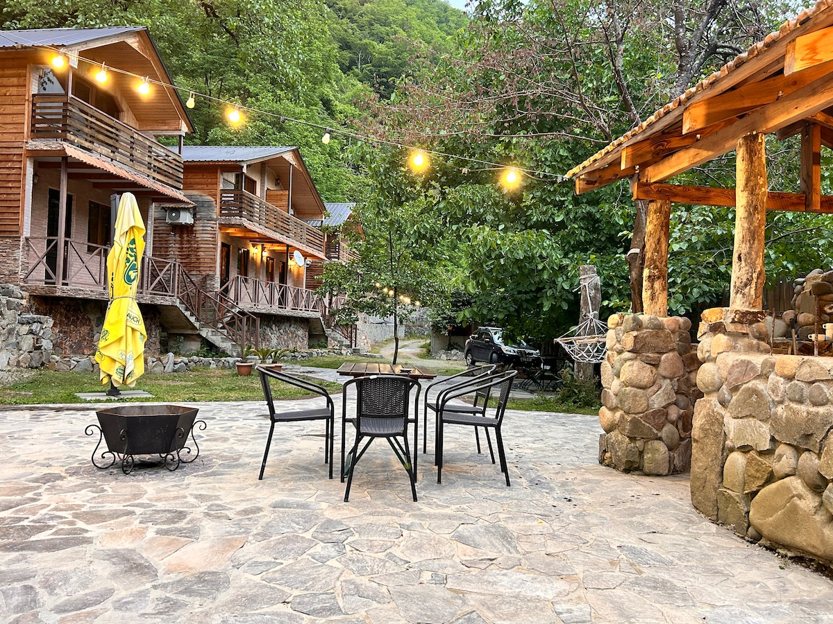Escápate a esta encantadora cabaña ubicada en la tranquila belleza de Bakhmaro. Con un bosque de coníferas detrás y un río suave en frente, este tranquilo refugio ofrece la mejor escapada para amigos y familias (hasta 8 huéspedes). Lo que te encantará: - Despierta con el aroma fresco de los abetos, las impresionantes vistas al bosque y los sonidos relajantes del río que fluye cerca. - Un punto de partida ideal para explorar los senderos, bosques y montañas únicos de Bakhmaro. - Entorno y decoración rústicos - Todas las comodidades necesarias