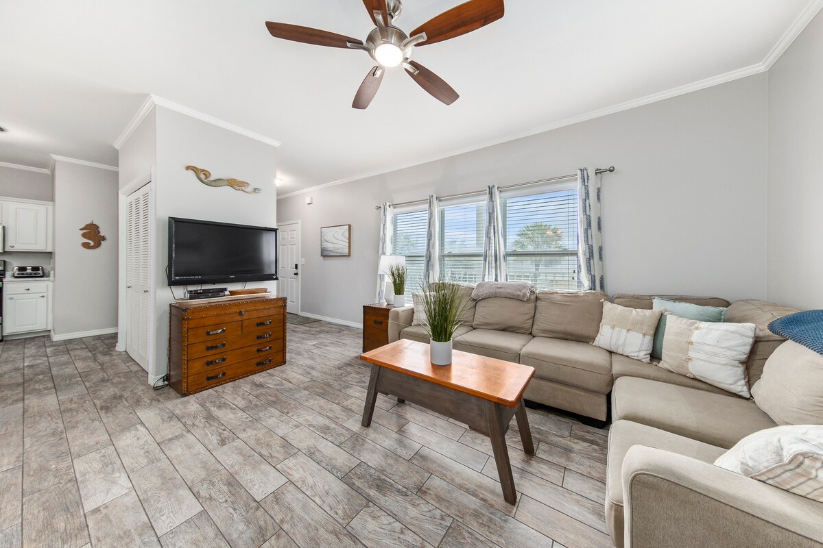 Esta elegante residencia de 1 dormitorio y 1 baño está situada en el centro de Gulf Shores, específicamente en Moon Raker en Beach Blvd. La unidad cuenta con una deliciosa paleta de colores claros y aireados y una decoración de buen gusto inspirada en la playa. Los huéspedes disponen de un cómodo espacio de estacionamiento a pie de calle. Una tienda de comestibles, Pier 33, está a solo una manzana de distancia, y los lugares de interés para comer, incluido el Hangout, son fácilmente accesibles a pie. La playa está convenientemente ubicada justo enfrente con acceso dedicado. Recientemente renovada, esta unidad presenta detalles de madera, techos personalizados, electrodomésticos de acero inoxidable y pisos nuevos. Ofrece la comodidad adicional de una piscina y lavandería en el lugar.