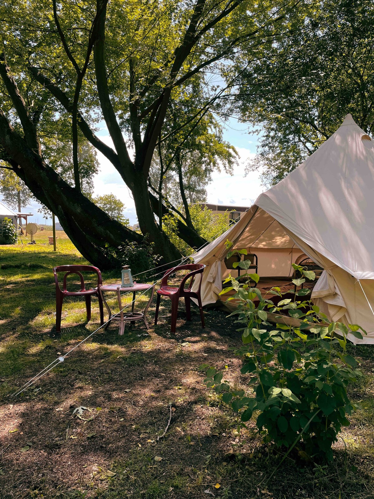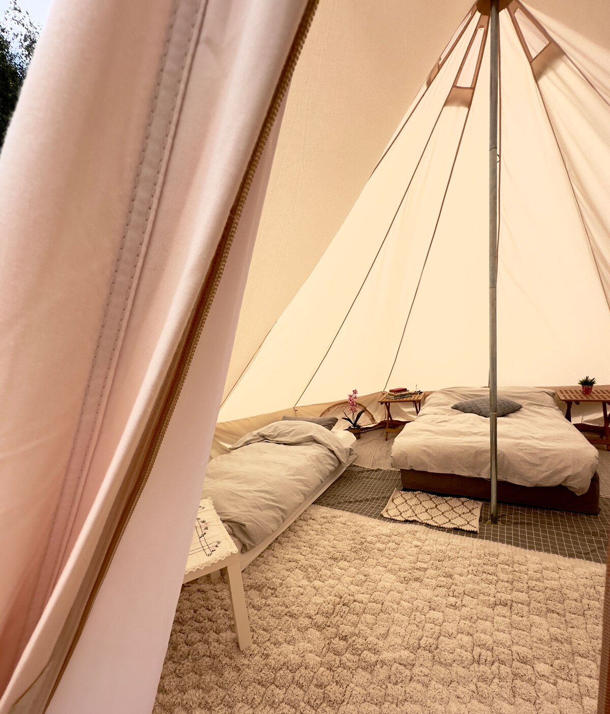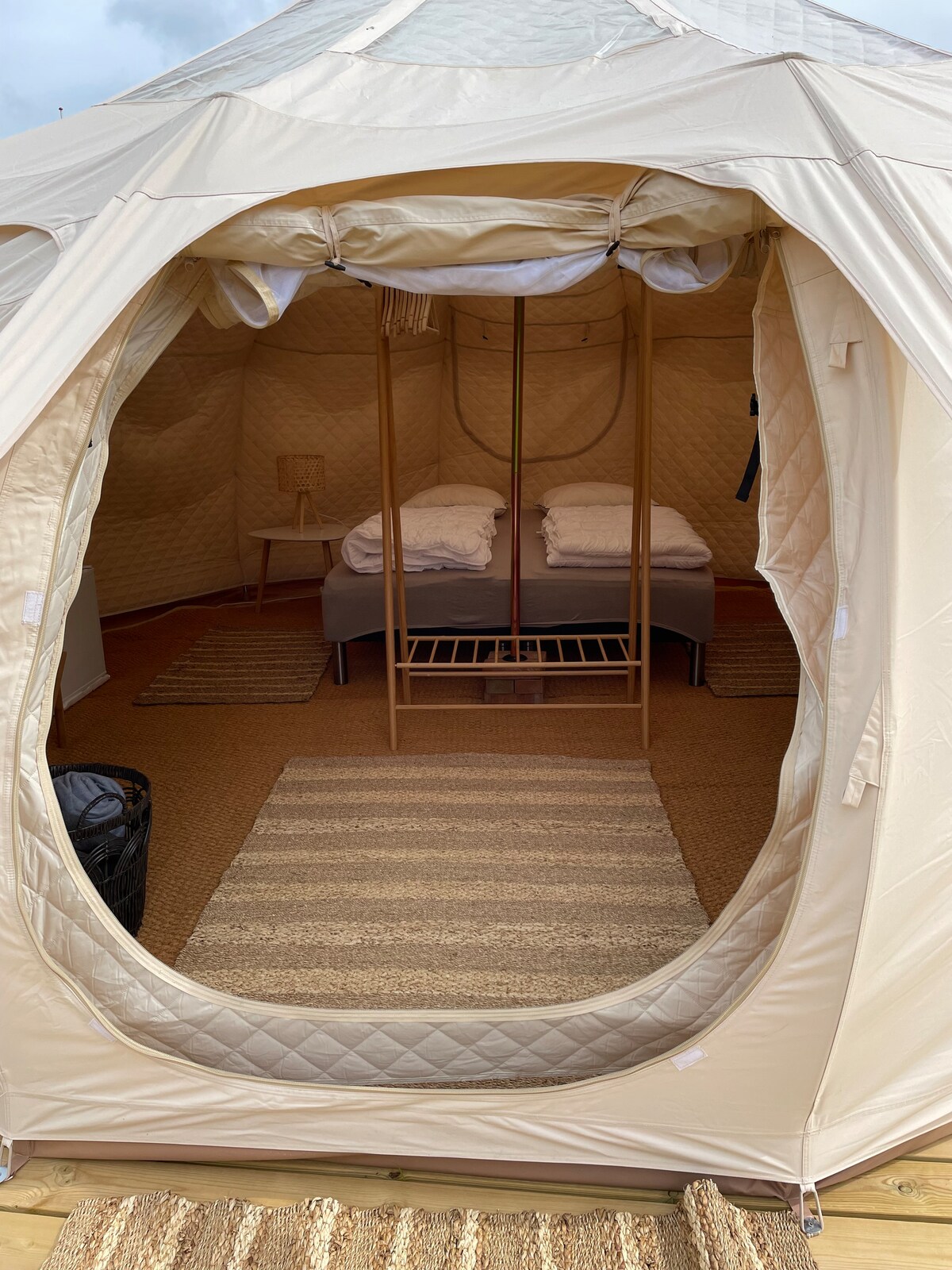 La tienda de glamping es espaciosa y está elegantemente decorada con cómodas camas, suaves colchas y un ambiente acogedor. La tienda está equipada con aparatos de calefacción para que pueda disfrutar de su estancia, independientemente del clima. También encontrará un baño privado cerca de la tienda. En la tienda de glamping también tiene una terraza privada donde puede disfrutar de su café de la mañana o terminar el día con una copa de vino. Si el tiempo no mejora, es posible refugiarse en el cobertizo, donde se encuentra la sala de estar y una pequeña cocina.