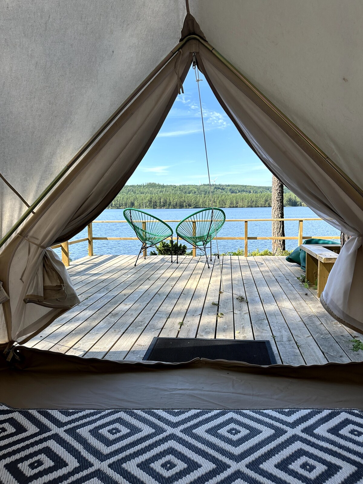 ¡Experimenta la naturaleza con comodidad en nuestra tienda de glamping! Duerme bien en una cama de 180 cm de ancho con edredones gruesos y almohadas de plumón suaves, todo para una estancia verdaderamente relajante. La tienda de campaña se encuentra en una terraza privada en una parte aislada de Strömsnäs Naturcamping, rodeada de naturaleza y con vistas al agua. Traes tus propias sábanas y toallas. La cocina compartida, la ducha y el inodoro están muy cerca. Para un lujo adicional: reserva nuestra sauna de leña junto al lago. Hay WiFi gratuito disponible en el área de recepción.