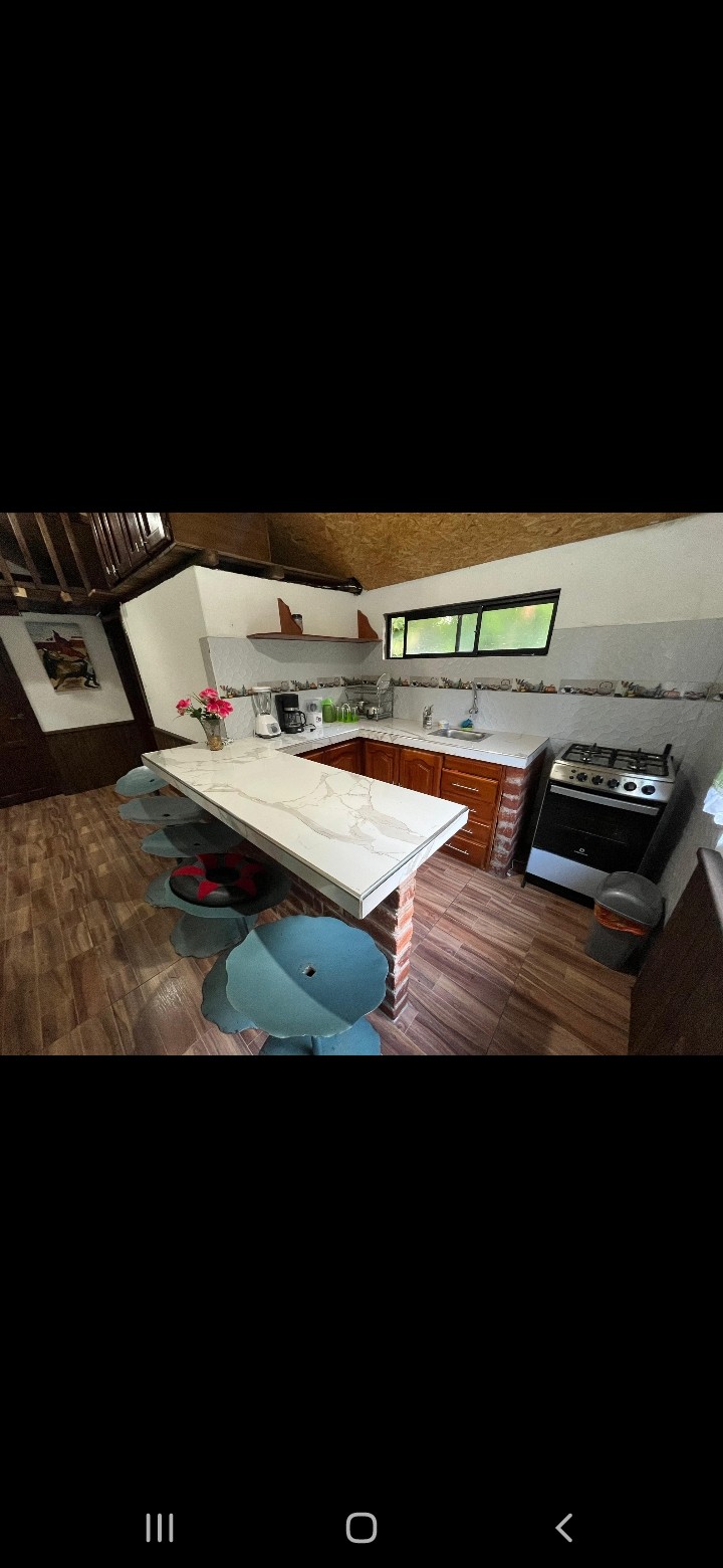 Es una casa cabaña, ubicada a 7 minutos del centro de Baños ,lleno de áreas verdes y jardines ,orquídeas y diversidad de aves , rodeada de montañas y una vista impresionante a la cuenca del rio Pastaza , única para el descanso y el relax familiar. Adicional para su conocimiento necesitan subir 38 escalones de cemento y piedra rústica , al final tendrán la recompensa de la magnífica vista al río Pastaza desde lo alto y su recién inaugurada hidropiscina de agua temperada.