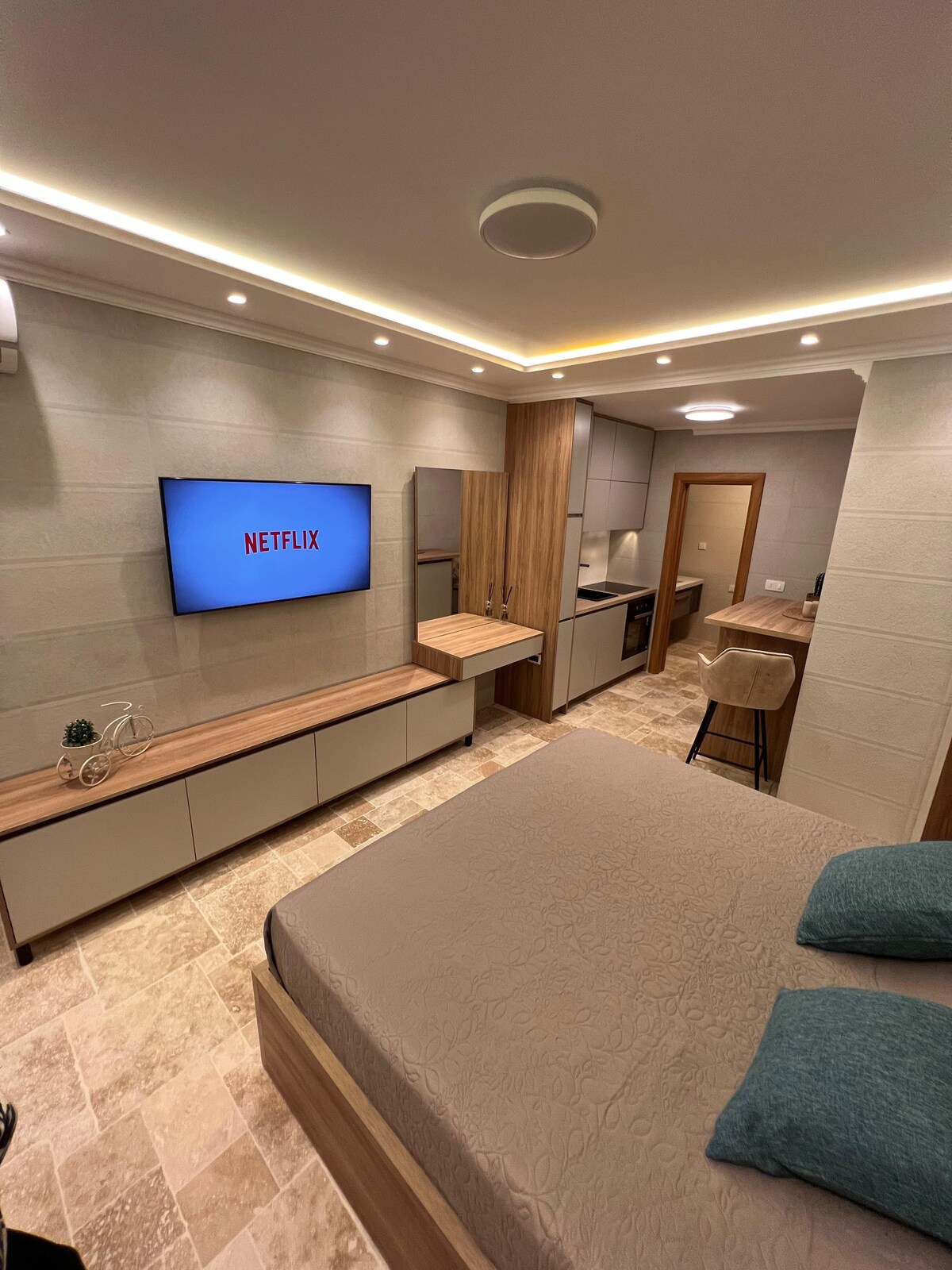 Este es un estudio ubicado en Sutomore a solo 10 minutos a pie de la playa. Es una parte de un complejo de edificios de apartamentos que tiene 8 apartamentos similares a este. Este hermoso y acogedor apartamento en la esquina tiene un cama tamaño queen, cocina pequeña, mesa de comedor, armario, baños grandes y un pequeño y lindo balcón con sofás perfectos para un café por la mañana y un frío con la brisa del verano. Se puede agregar una cama individual extraíble para una tercera persona.