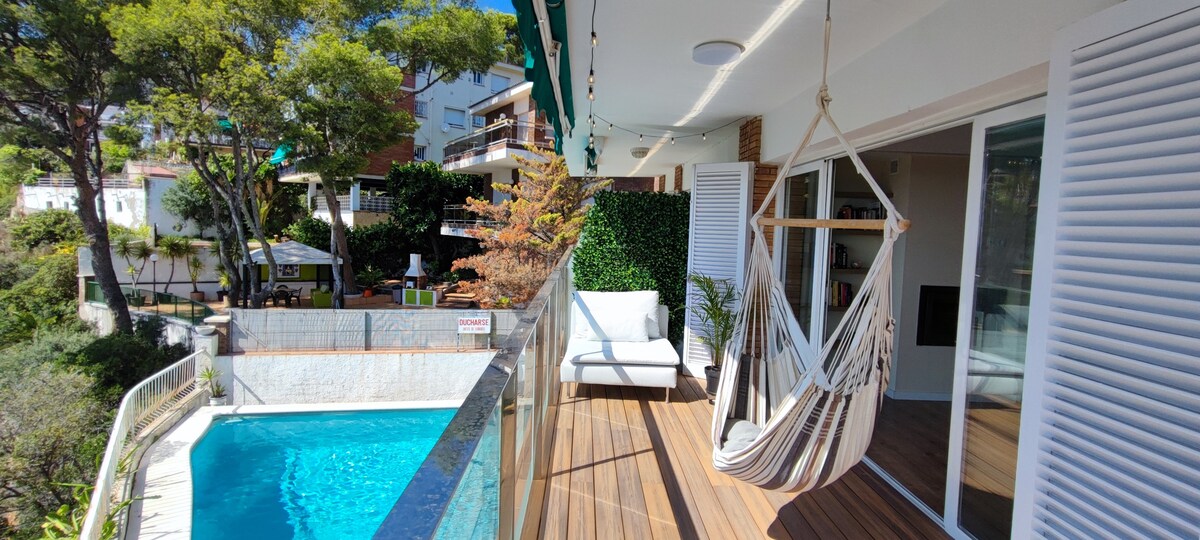 Relax and disconnect in this quiet, private, beautiful and elegant apartment with the amazing sea view. If you are looking for a place to spend few days out of the city, with a pool, amazing views and home cinema, you just found a perfect place. The flat is in the quiet district of Castelldefels, a 10 min by walk to the beach Unique place tastefully decorated and recently renovated. A special place for people who look for a privacy and peace. The flat doesn't have air conditioning.