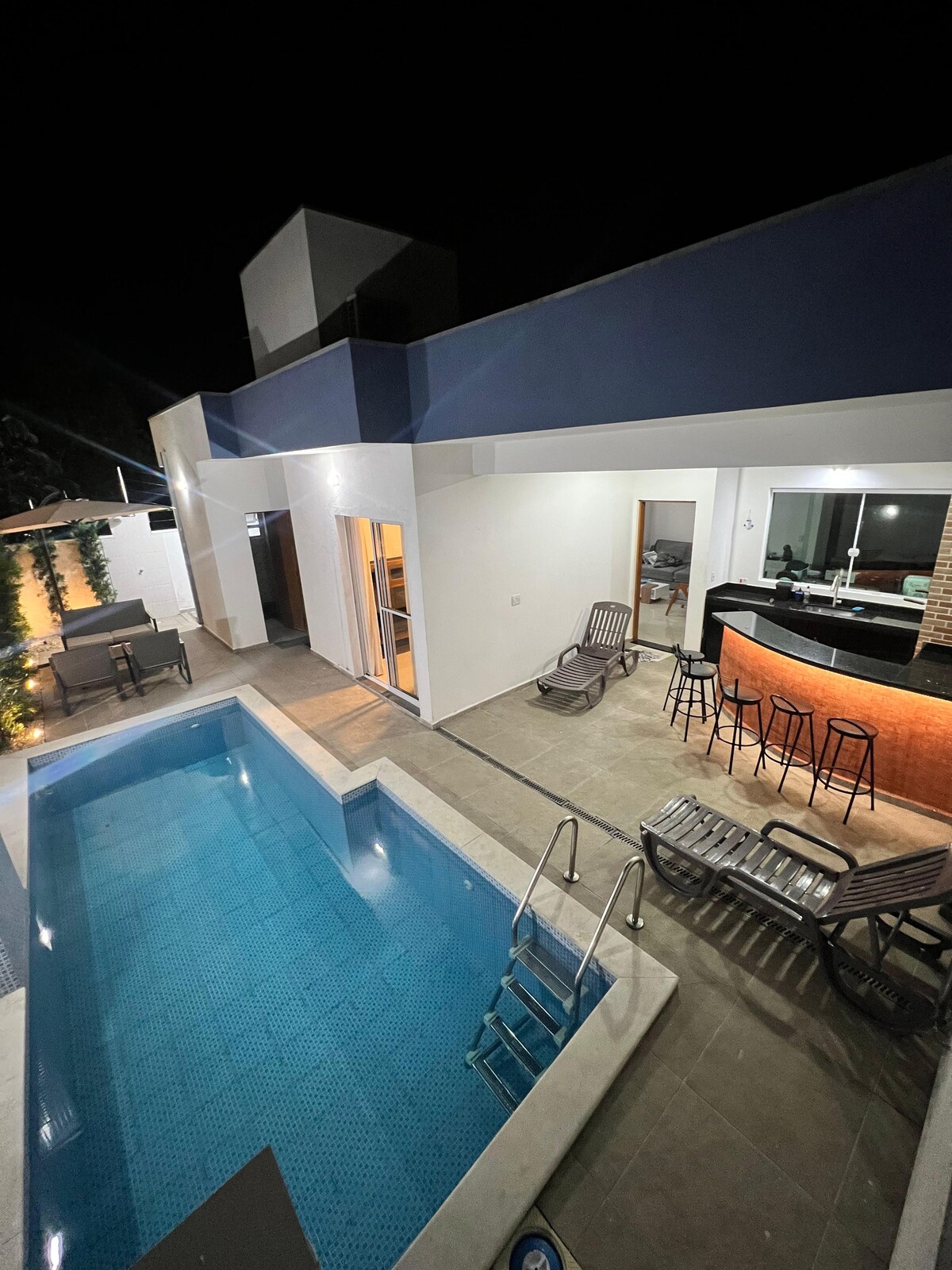 Relájate con toda la familia en este alojamiento tranquilo. Casa en Itanhaem en el complejo Gaivota, a 100 metros de la playa, casa con 2 dormitorios y 1 suite, todos con aire acondicionado, tiene capacidad para 20 personas, con una sala de estar y una gran área gourmet con parrilla, 3 baños, garaje para 3 autos, una hermosa piscina con hidromasaje y cascada, excelente casa para familias y grupos de amigos.