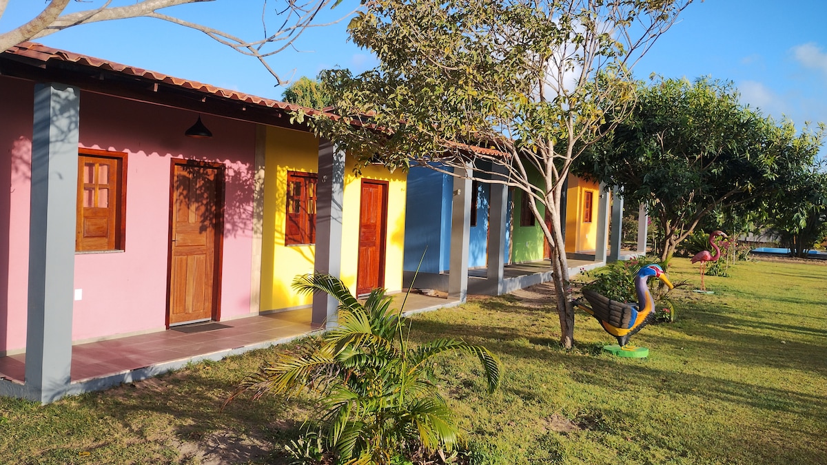 Suite encantadora y espaciosa con cama tamaño queen + cama individual, aire acondicionado, hamaca y escritorio. Ubicado en el galardonado pueblo de Bar da Hora (Braztoa 2024, destacado en Folha de S. Paulo), a solo 15 minutos en canoa de Atins (traslado no incluido). Naturaleza, silencio y comodidad. Desayuno incluido | Tours con guías locales certificados | Conserje virtual. Turismo de Base Comunitária | Turismo de Base Comunitária