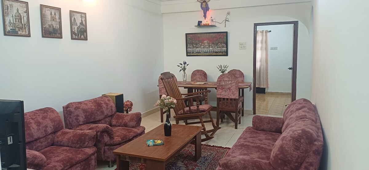 Certified by Goa Tourism 950 sq ft air-conditioned apartment: 2 bedrooms, 2 bathrooms, TV/living room, open kitchen; laundry nook + 500 sq ft non-air-conditioned space: dining for 4; sunroom sit-out; shaded patio; open-air balcony 300mbps internet; 4-5hr power backup; 50" Smart TV; books; board games; workstation & covered car park Located in Porvorim: 15min Panaji/Mapusa; 25min Calangute/Baga; 30 min Anjuna/Vagator; 45-60min Ashvem/Mandrem/Arambol; 60-75 min South Goa beaches; 120min Palolem