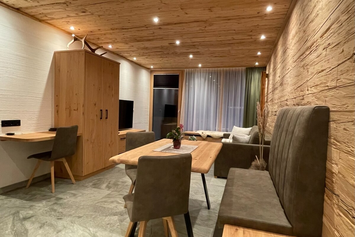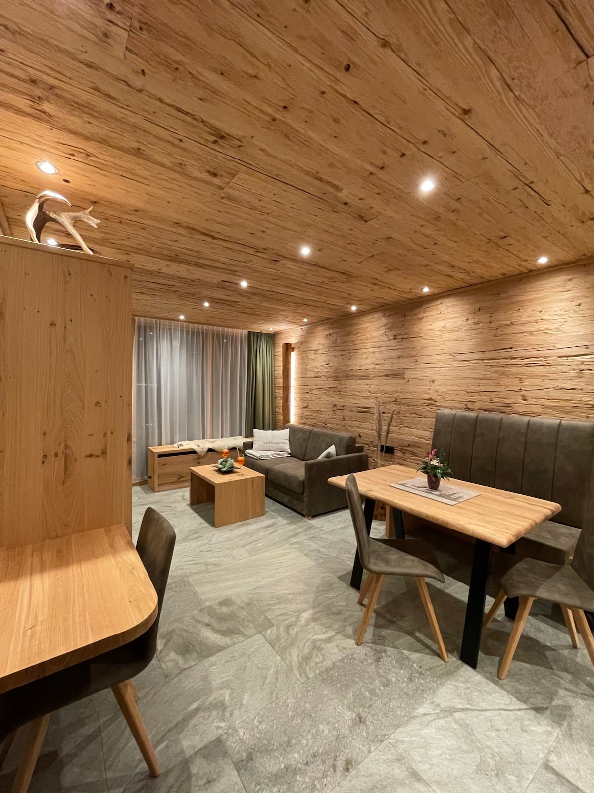 Tu relajación comienza desde el momento de tu llegada. Easy Check-In y tu propio aparcamiento subterráneo te están esperando. Luego, sube con el ascensor hasta el último piso. Entra en el apartamento Fitnessalm y siéntete como en casa en tu pequeño chalet. Siéntate y disfruta de las impresionantes vistas a las montañas en la terraza de 15 m², en la mesa del desayuno, en el cómodo sofá o en la acogedora cama de madera. Refréscate en la piscina de 18 metros de largo o haz unos largos.
