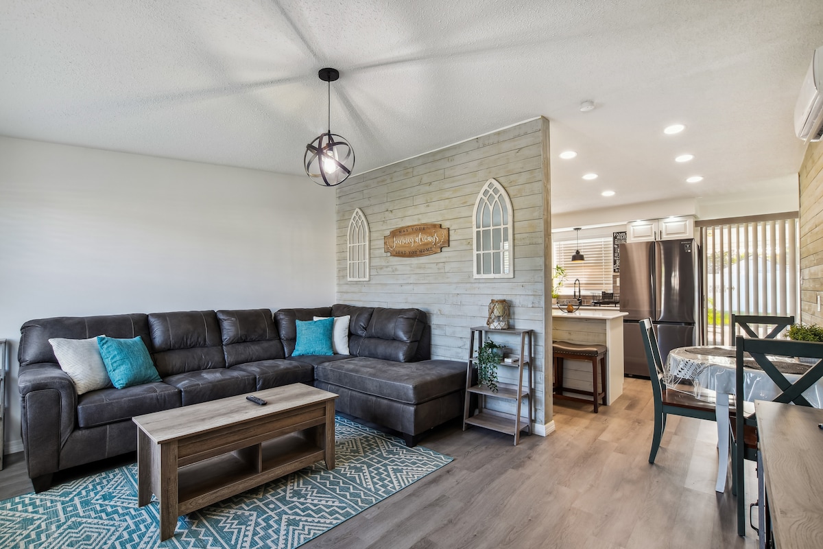 Relájate en esta acogedora casa de 2 dormitorios y 1,5 baños. Cada dormitorio tiene TV y aire acondicionado. Otra unidad de aire acondicionado se encuentra en la sala de estar. Un dormitorio tiene una cama tamaño queen y una zona de trabajo designada. El otro dormitorio tiene dos camas individuales. Mira tus películas favoritas en la sala de estar o toma unas copas en el porche trasero con vistas al bonito patio trasero vallado. Una cocina totalmente equipada y una parrilla te harán sentir como en casa. Se admiten perros, pero lee las normas antes de reservar.