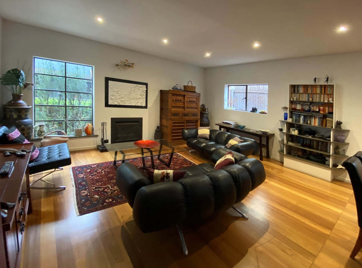 Moderna casa adosada espaciosa y llena de luz con gran sala de estar y comedor y cocina moderna totalmente equipada en la planta baja. En la planta superior, enorme dormitorio principal con una sala de estar y zona de trabajo y un balcón soleado con mesa y sillas. Posibilidad de alojar a 2 huéspedes adicionales en el segundo dormitorio (disponible bajo petición por un cargo adicional). Nuestro alojamiento se encuentra en una tranquila calle arbolada. A solo 15 minutos a pie de las playas de Brighton y Elwood; a 10 minutos a pie de la vibrante escena de cafés de Martin Street y de la estación de tren de Gardenvale.