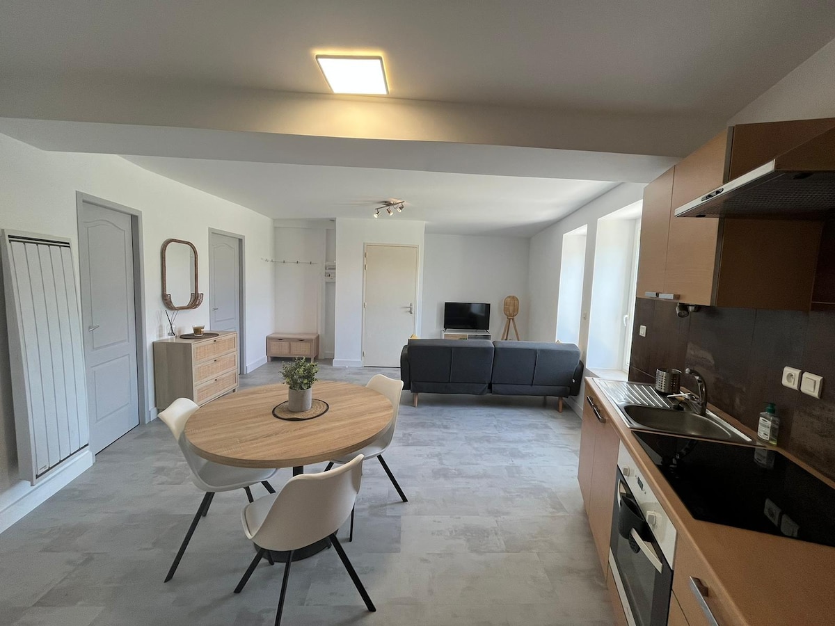 Bienvenido a nuestro encantador apartamento, situado en nuestra propiedad . El alojamiento es nuevo y acogedor, tiene capacidad para 5 personas. Para su comodidad encontrará lo necesario y un televisor conectado con Netflix, una terraza con mesa al aire libre. Tenemos 3 cabras y un poni que viven a pocos metros de la casa, por lo que no aceptamos a sus mascotas. Nuestro alojamiento se encuentra a 1 km de las grandes superficies , panadería , carnicería , frutería