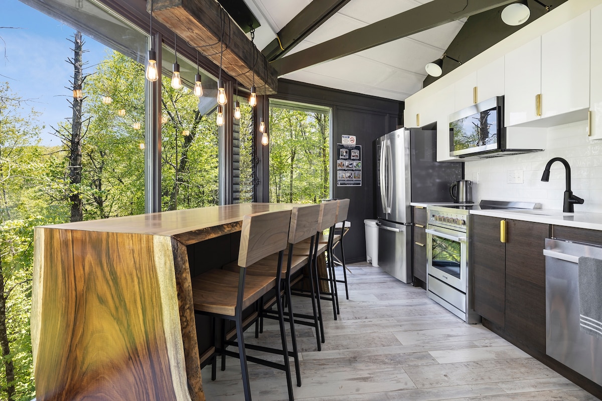Respira el aire fresco de la montaña y sumérgete en la naturaleza cuando te hospedes en esta casa de 2 dormitorios y 2 baños bellamente renovada y ubicada en las copas de los árboles de Beech Mountain, perfecta para familias o parejas que buscan una escapada romántica, con un acogedor diseño de una sola planta que aloja cómodamente a 4 personas. Disfruta de impresionantes vistas de 360 grados desde las ventanas del suelo al techo y la terraza privada, relájate en el área exterior con un bar personalizado y una estufa Solo, y experimenta la máxima relajación en tu seclu