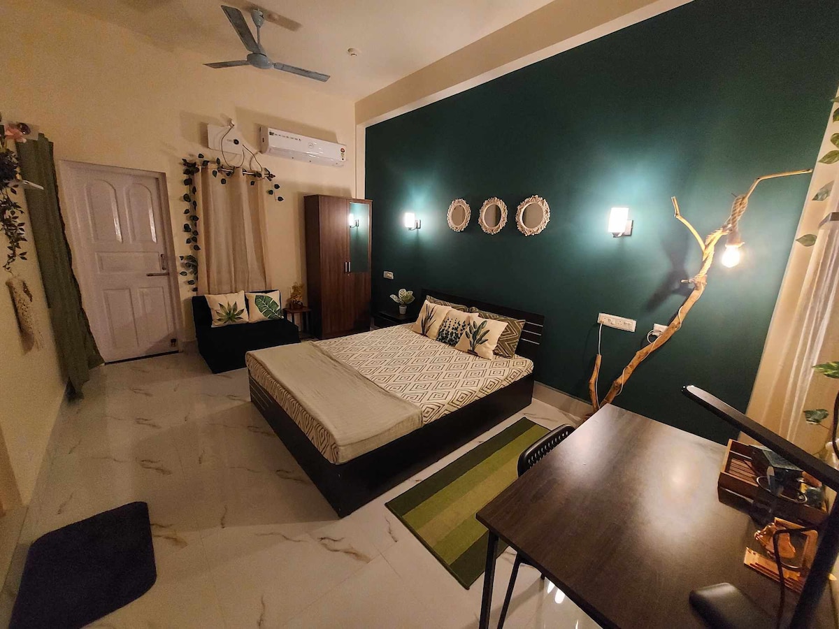 A perfect "stay" where you and your family can experience a peace with a homely environment. It's an air-conditioned single bedroom, with double bed, a study table and a chair, a wardrobe with mirror attached and a locker too, to keep your valuable items safely. Room is attached with a private kitchen, induction cooktop and basic utensils for your usage. A dinning space attached also have a 4-seater dining table, and a refrigerator too.