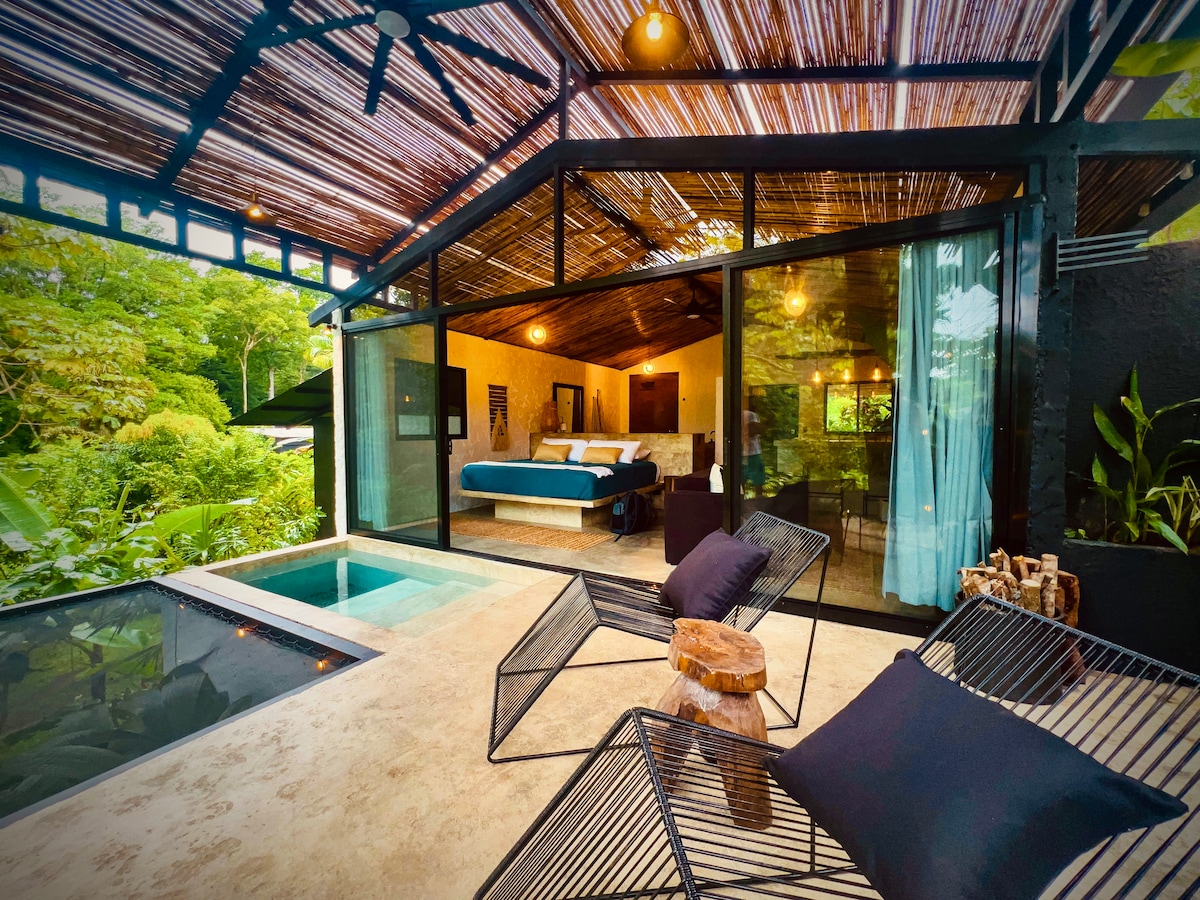 Al Mar by DeRide Escápate a nuestro refugio completamente privado de 350 m², rodeado de árboles mágicos y vida silvestre vibrante. Observa monos, pájaros, perezosos y mariposas en el exuberante patio trasero, que ahora brilla por la noche con luces encantadoras que transforman el jardín en una jungla de ensueño. Relájate en el jacuzzi, duerme profundamente en un acogedor dormitorio tamaño queen. Con comodidades modernas y un ambiente sereno, es perfecto para parejas que buscan romance, relajación cerca de impresionantes playas. ¡Alójate aquí y vive la magia!