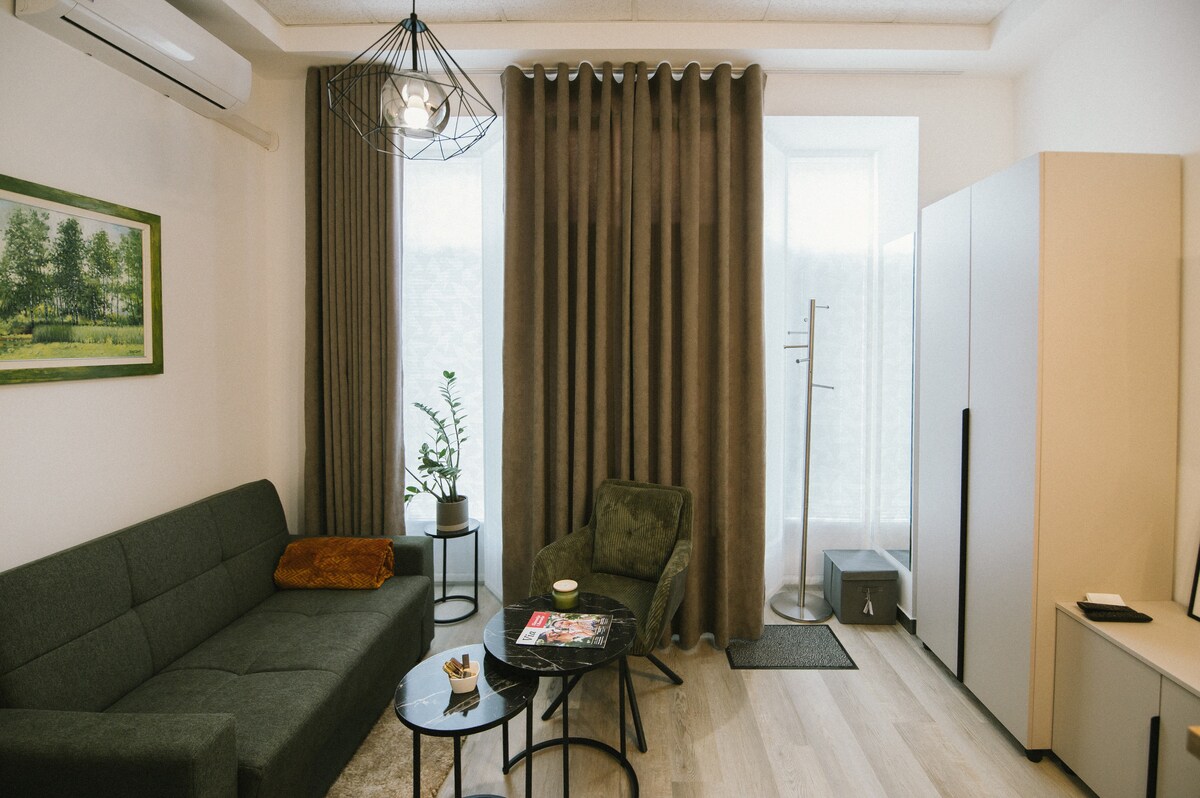 Este alojamiento único está decorado en un estilo inusual. El apartamento-estudio consta de una cocina con comedor y una zona con cama. El pequeño baño está separado por una puerta. El estudio está recientemente renovado y totalmente equipado, con aire acondicionado y conexión WiFi gratuita. Si necesita aparcamiento, debe reservarlo al reservar el apartamento (se encuentra en el garaje subterráneo de la estación de autobuses) y recibirá una tarjeta para su uso gratuito.