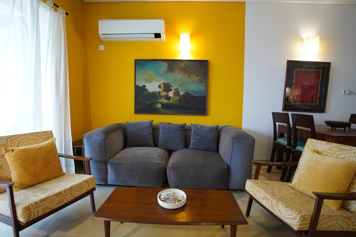 Disfruta de las ventajas de elegir un apartamento céntrico en el estado de Goa, que está a solo 15 minutos del aeropuerto internacional de Goa. Este acogedor 1 BHK tiene una cocina totalmente equipada, una cama tamaño queen, un aire acondicionado en el dormitorio, un sofá cama, 2 colchones adicionales individuales y 2 baños cómodos para 4 huéspedes. Las instalaciones tienen hermosas comodidades que puedes elegir para relajarte...disfruta de la terraza de yoga o el salón de la terraza...gimnasio, cancha de squash, mesa de billar o relajarte en la piscina...tienes muchas opciones.