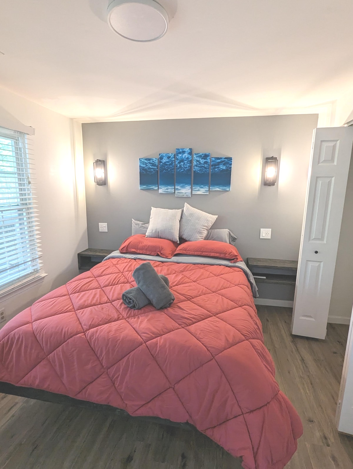 Este es un espacioso nivel inferior de una casa de nueva construcción. Esta zona privada para huéspedes cuenta con salón, comedor y cocina americana, además de un dormitorio y un baño. Los huéspedes solo comparten la entrada principal de la casa adosada con los propietarios que viven arriba. Este espacio privado decorado incluye un televisor inteligente, asientos cómodos, comedor para 4 personas, microondas, cafetera, nevera completa, tostadora/freidora de aire, cama tamaño queen, armario y cómoda. Hay lavadora/secadora disponibles bajo petición. Revisa las normas de la casa antes de reservar.