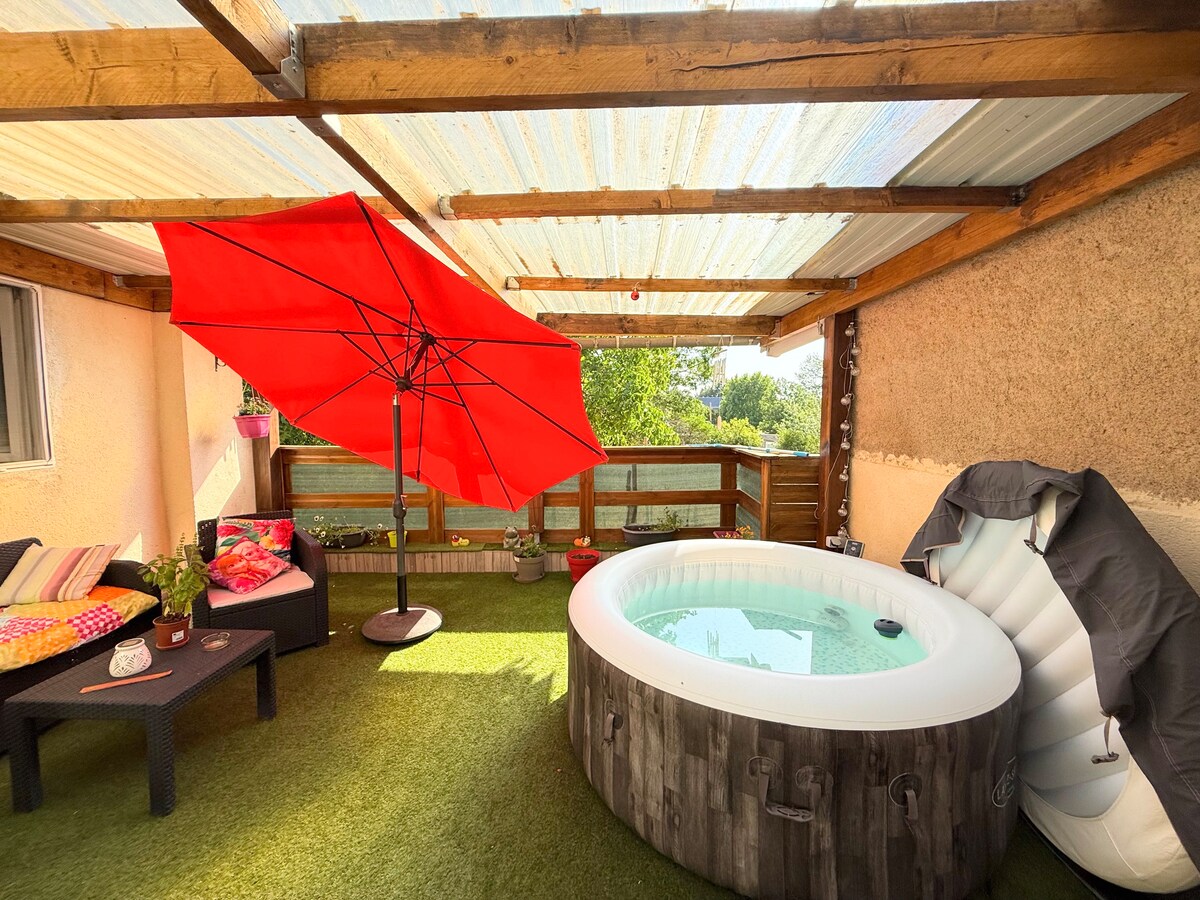 Alojamiento insólito en el ambiente «hobbit» enclavado en el fondo de un jardín salvaje con vistas a la ciudad. Se accede a través de una ruta de senderismo (empinada). El alojamiento consta de una sala de estar con chimenea, una pequeña cocina, una alcoba para el dormitorio, un pequeño baño, una terraza con vistas al valle y la ciudad (a 1 km), y novedad, un baño calentado con leña (excepto en verano) Hay velas y música disponibles para crear ambiente ¡Ideal para una estancia romántica o un momento fuera de temporada!