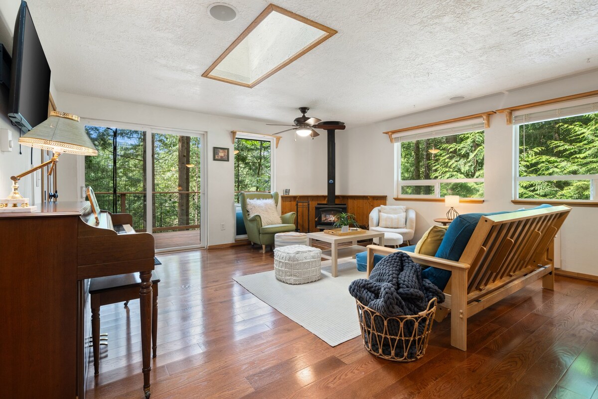Relájate en este elegante y sereno refugio en el bosque, tu campamento base perfecto para la aventura o la relajación. Ubicado en un entorno forestal tranquilo, está a solo unos pasos de un sendero panorámico de la reserva natural y cerca de millas de senderismo y ciclismo de montaña. Después de un día de exploración, relájate con comodidad y disfruta de los tranquilos alrededores. En invierno, disfruta de las pistas en el monte Hornea o cruza la frontera para un día de esquí en Cypress Mountain. Una escapada acogedora y moderna con acceso durante todo el año a lo mejor de la naturaleza.