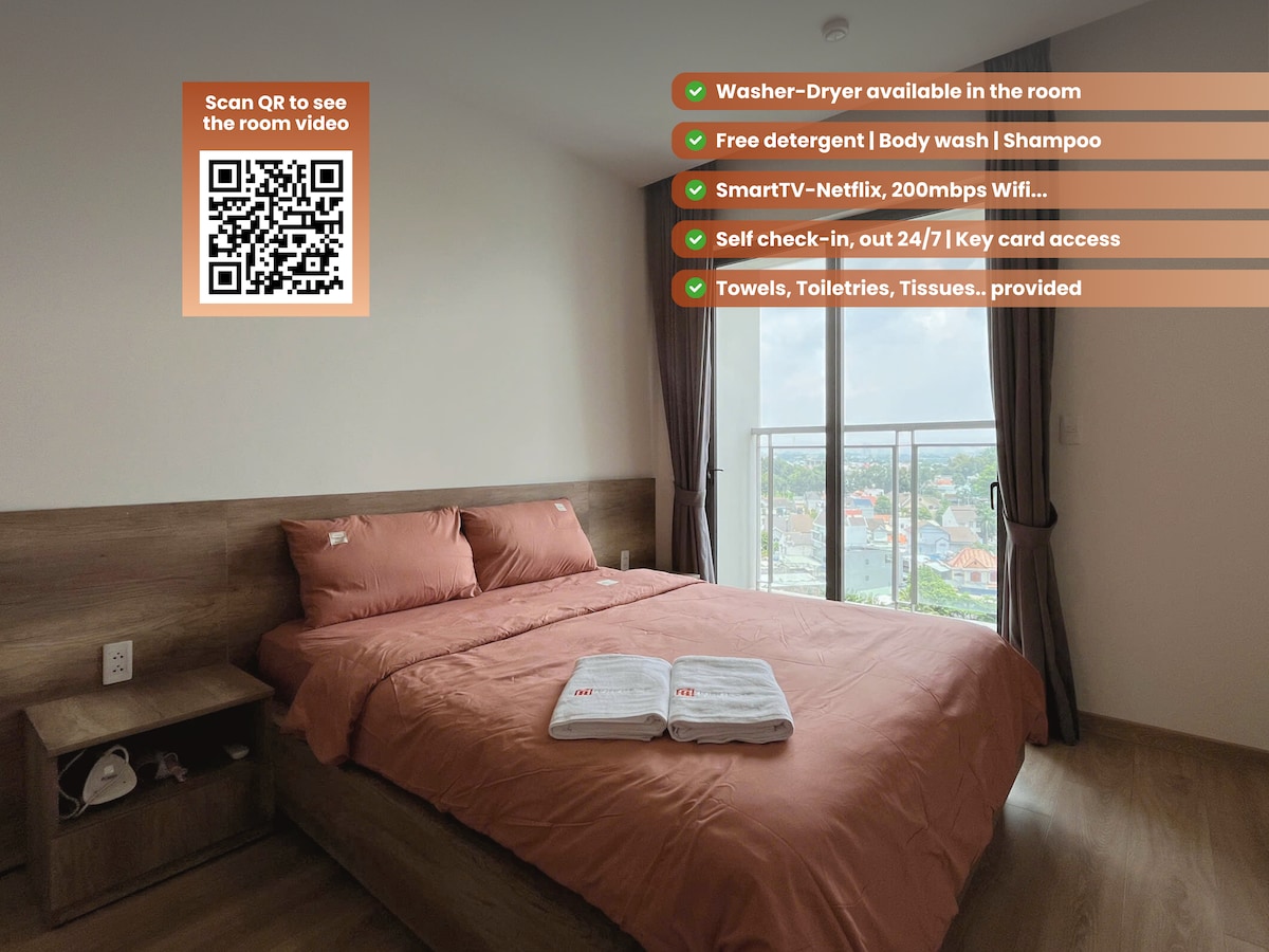 This is a modern studio in my serviced apartment. It's comfortable to stay in short & long term. - Balcony & lots of natural light - 1m8 soft bed to sleep well - Kitchen is fully equipped to cook - Private bathroom: full of essentials - Elevator, air conditioner, fast wifi, smart TV, wardrobe, desk, chair, sofa - Cleaning & laundry - FREE parking You will enjoy a stylish experience in the city center. Only 5 mins to night market & Bach Dang walking street. #Address: D4 street, Thu Dau Mot City