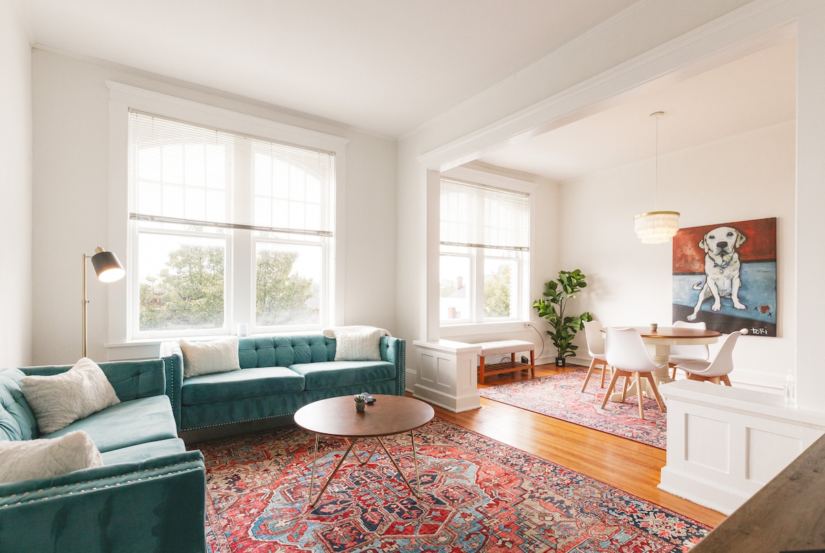 A peaceful getaway to relax, unwind, and feel at home away from home. This third floor apt is spacious and bright with a mid-century modern and eclectic style. Private guest entrance is in the front of the house, located in the heart of downtown Charles Town. Just park your car and walk to all the local restaurants and shops! Only 10 minutes from Historic Harpers Ferry. You will fall in love with this place.