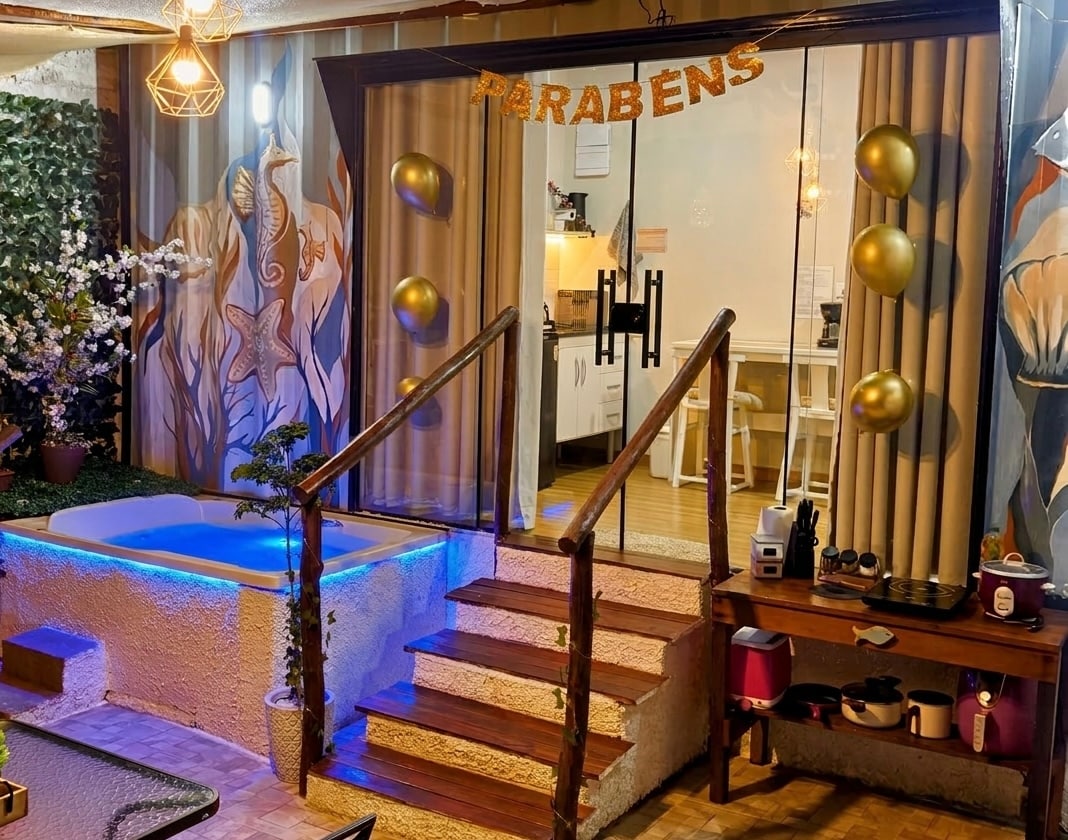 🛁🔥 Escapada romántica en Bertioga con jacuzzi (hidrospa) climatizado a 36 °C (97 °F), chimenea al aire libre, parrilla para barbacoa y jardín privado, a 4 minutos en auto de la playa de Enseada o a 16 minutos a pie. Ideal para dos adultos con un bebé. ❤️ Opcional: decoración romántica con globos y velas. Consulta el chat.