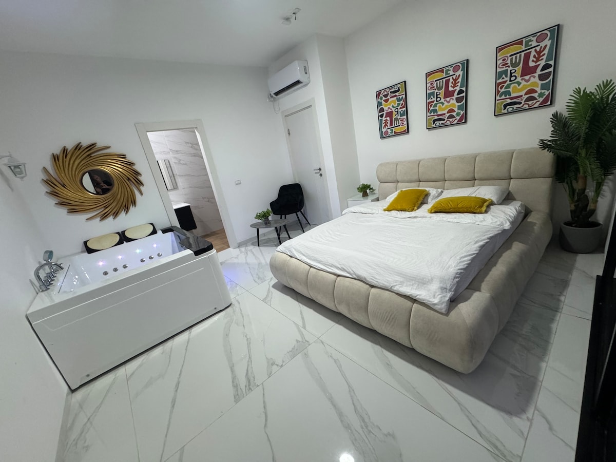 Una unidad de alojamiento para parejas, adyacente a una casa de dos familias en el barrio de Harhava, en el borde del kibutz, frente a campos agrícolas. Ideal para parejas que buscan alojamiento de alta gama. El alojamiento es nuevo, está diseñado con una línea limpia y minimalista. Encontrarás un lujoso jacuzzi doble, una amplia cama tamaño king con opción de separación, mesitas de noche y sábanas y toallas de alta calidad. La unidad está separada de la casa por 2 puertas cerradas, incluida una puerta acústica, para una completa tranquilidad y privacidad. No hay cocina pequeña, hay una pequeña nevera, hervidor de agua y rincón de café. Hay una variedad de carritos de café, restaurantes, cafeterías y una tienda de comestibles. Muy cerca de muchos jardines y salas de eventos.