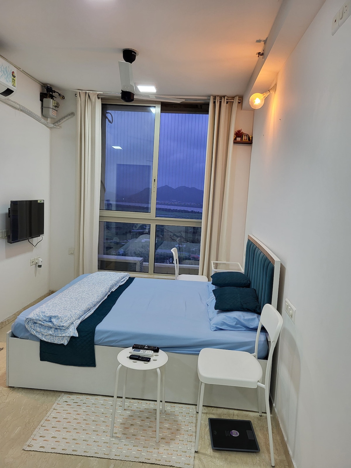 Estudio de lujo con un interior acogedor en la urbanización Hiranandani, con impresionantes vistas al arroyo y a la montaña.Prestaciones • Se admiten parejas • Cama tamaño queen con sábanas y almohadas de lujo • TV inteligente, wifi de alta velocidad y aire acondicionado. • Cocina americana totalmente equipada con nevera, hervidor y utensilios. • Baño moderno con grifería de primera calidad y agua caliente. • Balcón privado con vista panorámica • Seguridad 24/7, ascensores y acceso seguro. Ideal para viajeros solitarios, parejas, huéspedes de negocios o familias pequeñas.