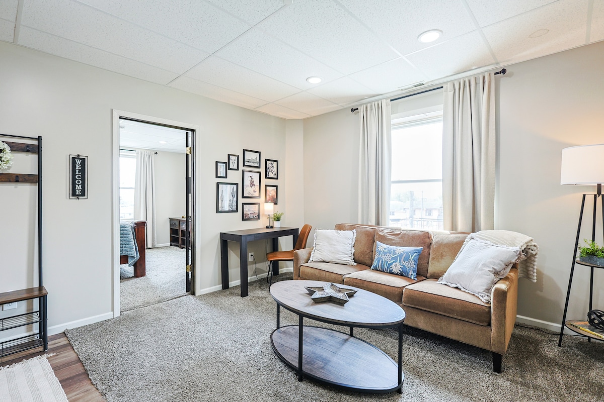 Escápate a la acogedora cabaña, una encantadora habitación de estilo loft inspirada en la calidez y la sencillez de un refugio de cabaña. Este acogedor espacio cuenta con paredes de revestimiento de madera de troncos reales, techos de vigas rústicas a la vista y una hermosa chimenea de piedra, todo envuelto en comodidad moderna. Situado en el corazón del centro de Sabetha, dentro del Limestone Lodge, disfrutarás de una ubicación privilegiada en Main Street, cerca de restaurantes, tiendas y atracciones locales. *Nota: cama ubicada en un loft al que se accede por escaleras.