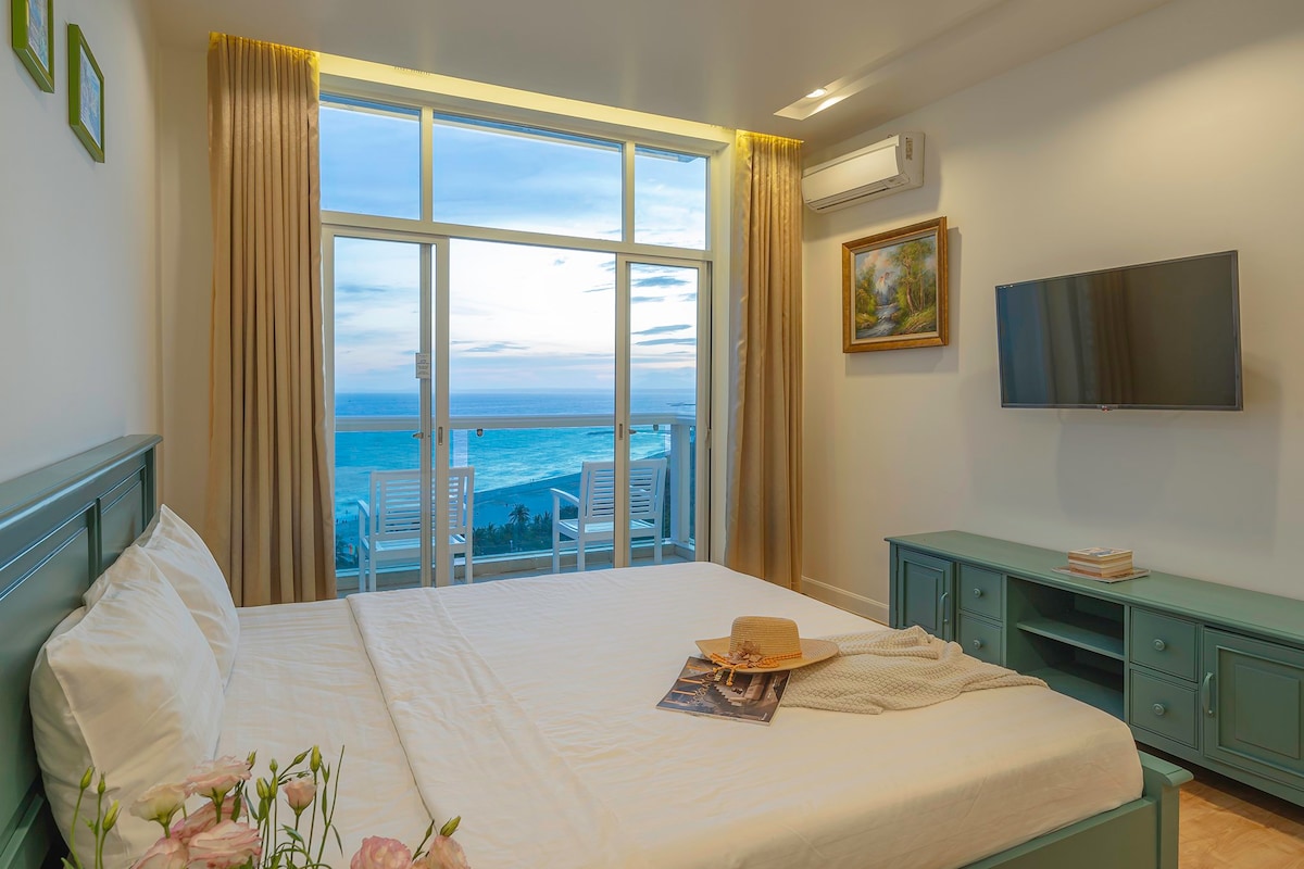 Un apartamento grande de estilo moderno y recién renovado frente a la playa de 2 habitaciones en Ocean Vista Phan Thiet con vistas al mar de las aguas cristalinas y estacionamiento gratuito. A solo unos pasos de la playa. El apartamento cuenta con 2 dormitorios y 2 baños completos. Dormitorio principal: una cama tamaño king y baño completo (que incluye ducha y bañera), segundo dormitorio con cama tamaño queen + baño completo. Internet WiFi rápido y gratuito ilimitado de 300 mb y un televisor Samsung LED 4K de 40 pulgadas con Netflix HBOGO y servicio TIVO HD de 500 canales.