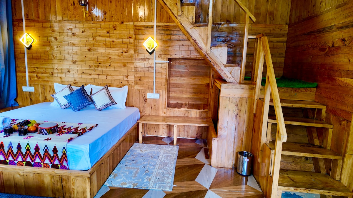 Despierta con vistas al valle brumoso, silencio del bosque y puestas de sol doradas desde tu balcón privado en forma de A. Bienvenido a Tranquil Triangle, una acogedora cabaña de estilo alpino escondida en lo profundo de los bosques de deodar de Jibhi, perfecta para parejas, familias y grupos pequeños que buscan una escapada tranquila a la montaña lejos del ruido de la ciudad. Disfruta de mañanas serenas, cálidas noches de fogata bajo cielos estrellados y una experiencia verdaderamente natural fuera de la red con comodidades modernas.