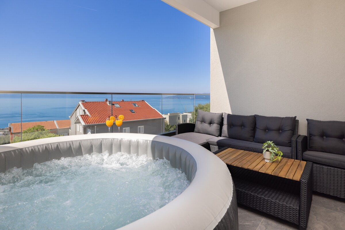 Nuevo departamento moderno, con una gran terraza con hermosas vistas al mar y a las islas y a la montaña Biokovo. En la terraza hay un jacuzzi y una zona para tomar el sol, rodeada de olivares y pinos. El alojamiento está en una zona tranquila, un barrio residencial de Makarska. Cook se encuentra entre el pequeño pueblo de Krvavica y el pueblo de Makarska. Se recomienda utilizar un auto para la ciudad, la playa y las tiendas. Playa: 1-1,5 km, tienda: 1,5 km-2 km, gasolinera: 400 m, centro de Makarska aprox. 3 km. Es posible caminar.