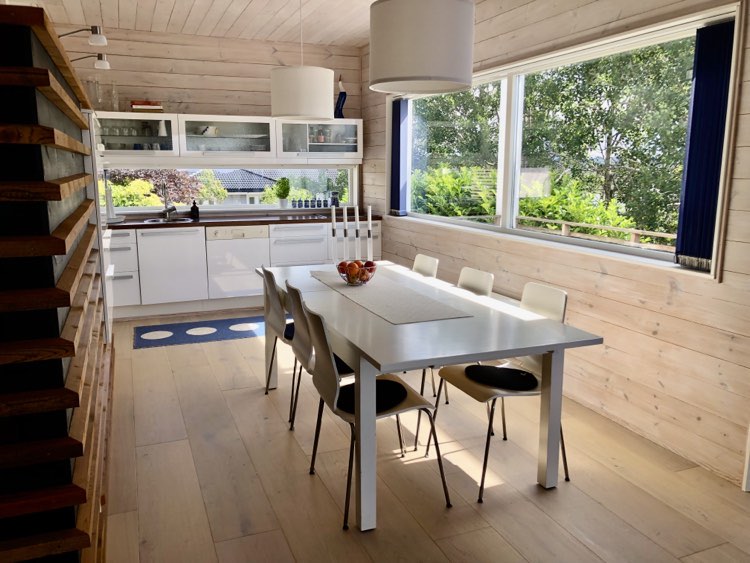 Una casa de campo de 2017 con hermosas vistas al mar que se puede disfrutar desde los grandes ventanales o desde el jacuzzi en la terraza. El interior tiene colores naturales tranquilos, de estilo nórdico. Chimenea en la sala de estar, solución abierta desde la cocina. 1er piso: 2 dormitorios, 2 baños, sala de estar y cocina, así como lavandería y pasillo. Segundo piso: 2 dormitorios y loft con sofá cama doble. Un total de 14 camas y camas de viaje. Cualquier colchón adicional para el piso. Grandes oportunidades de senderismo cerca, alquiler de barcos, así como una bonita playa de arena debajo del hotel y centro vacacional Panorama cerca.