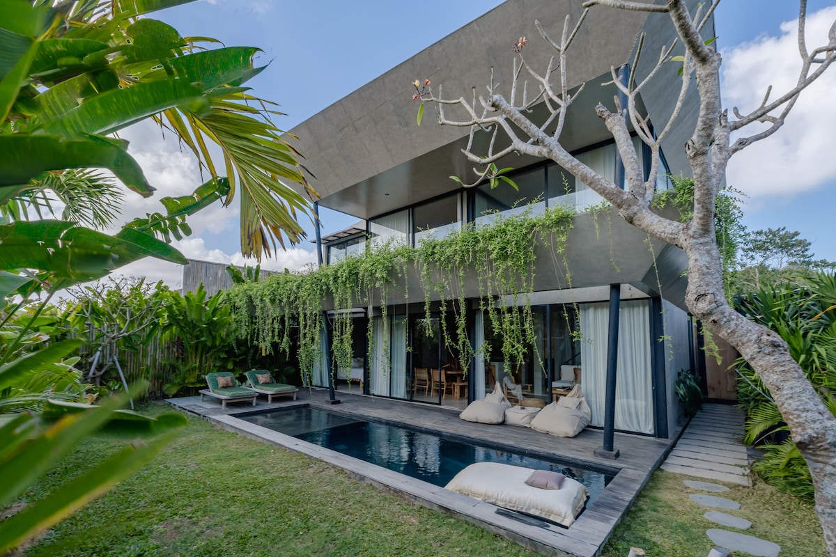 Villa de diseño moderno tropical con piscina privada en Uluwatu. Escápate a tu propio santuario privado en esta villa de 1 dormitorio bellamente diseñada en un rincón tranquilo de Uluwatu. Esta villa combina la arquitectura moderna tropical con materiales naturales balineses y ofrece el equilibrio perfecto entre estilo, comodidad y relajación. “Nuestra ubicación privilegiada está a solo unos minutos de los mejores cafés y restaurantes de Uluwatu, pero lo suficientemente escondida como para permanecer tranquila y serena”.