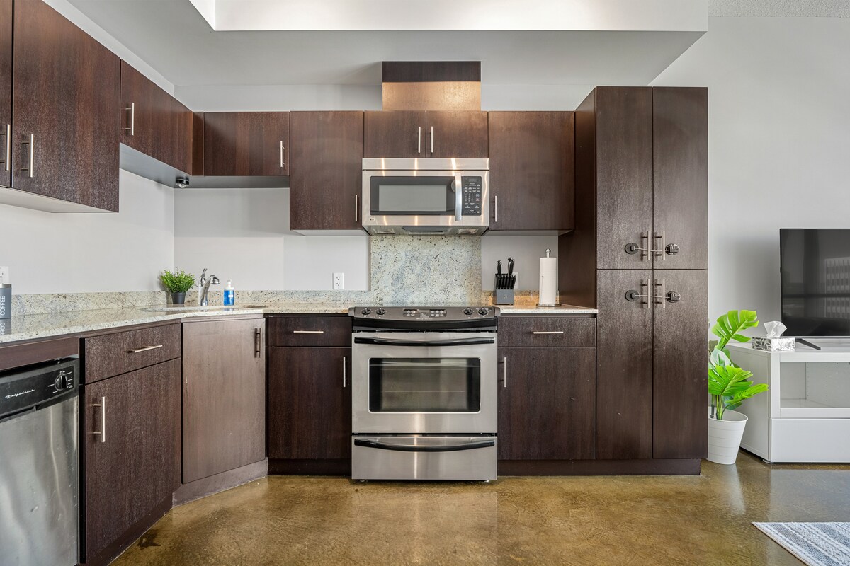 Aparcamiento subterráneo climatizado GRATUITO. Despiértate renovado bajo un mural bohemio con flecos en un acogedor escondite en el East Village de la ciudad, justo enfrente del parque Fort Calgary. Las encimeras de cuarzo y los azulejos de mosaico se combinan con suelos de madera dura de ingeniería y una decoración gris tranquila.