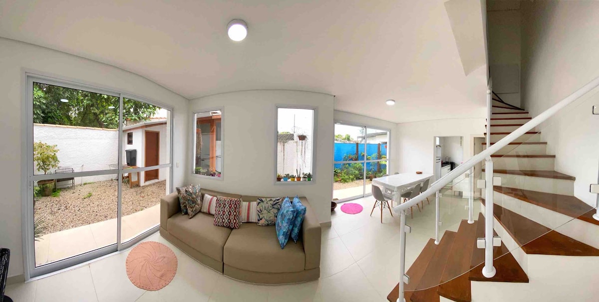Casa acogedora con "Privacidad" En la planta baja, sala de estar, cocina y un baño con ducha. En el exterior, barbacoa, lavabo y hermoso jardín. En el piso superior 2 dormitorios, uno con cama Queen y en el otro dormitorio dos camas individuales y altillo con una cama doble. Aire acondicionado en las habitaciones. Wifi de 450 mbps de fibra El condominio está frente a la plaza Por do Sol, solo cruza la calle y ya estás en la playa. El condominio cuenta con piscinas para adultos y niños y una pista polideportiva.
