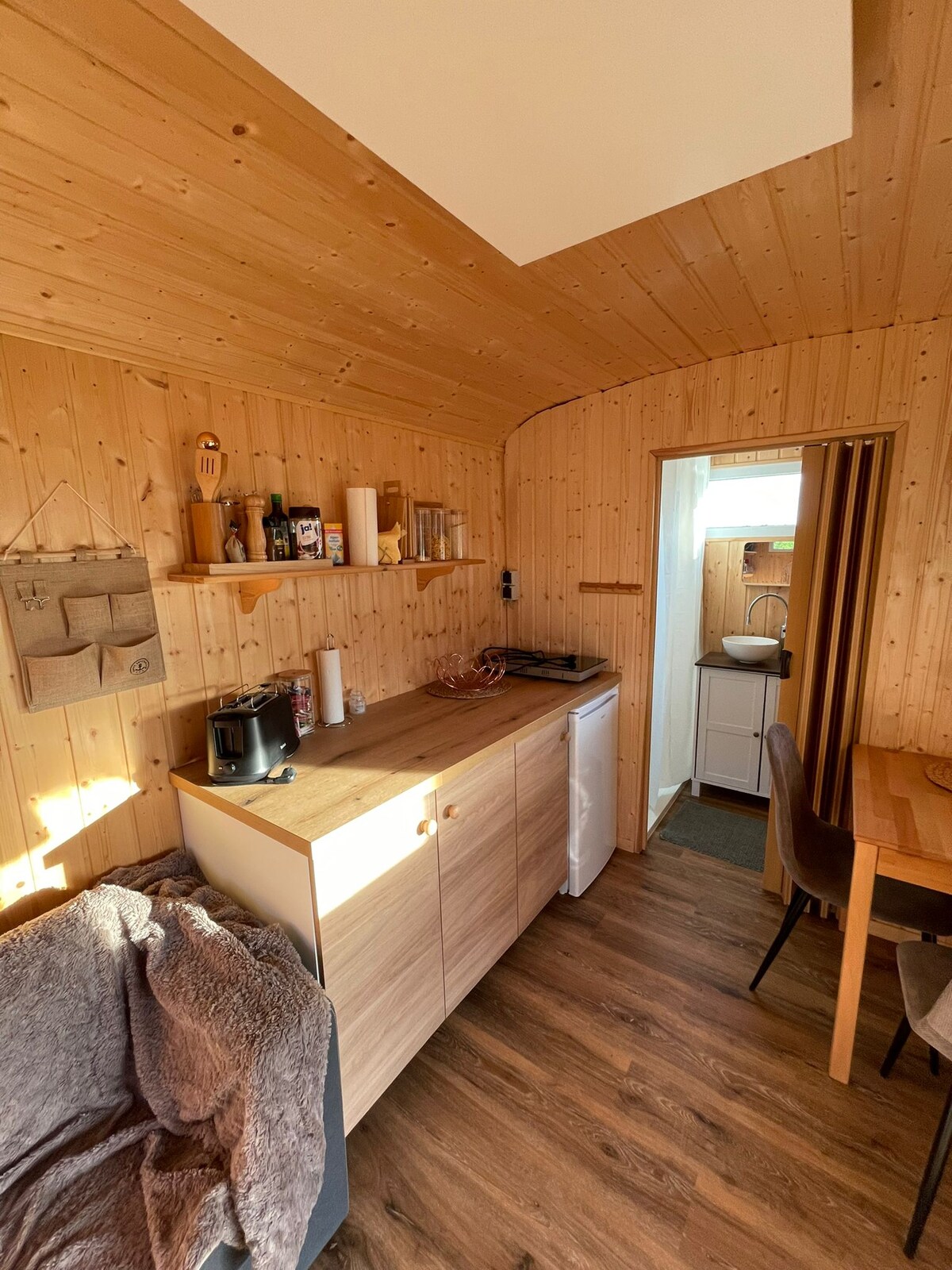 En una colina, rodeada de árboles viejos, se encuentra una de las tres cabañas poco convencionales, cada una con dos camas. En cualquier clima (excepto en invierno), la cabaña puede ofrecer a los amantes del camping, ciclistas o a quienes se decidan en el último momento una alternativa a la tienda de campaña. Solo necesitarás llevar un saco de dormir y una toalla. La comodidad consiste en un techo sobre la cabeza, un lugar para dormir, una bonita fogata y una ducha exterior caliente con aseo separado.