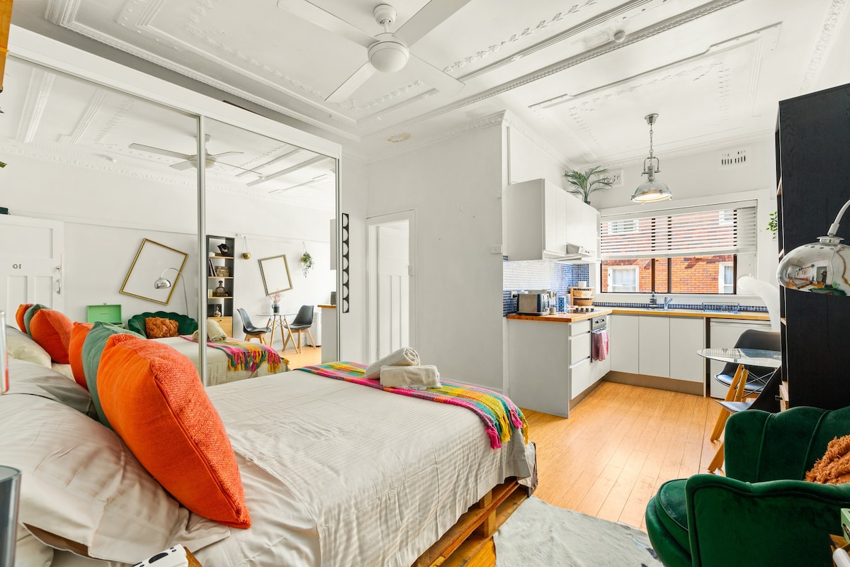 Escápate a nuestro estudio minimalista bohemio en el corazón de la vibrante Bondi, a pocos pasos de la playa de fama mundial. Este peculiar y colorido refugio se adapta cómodamente a 2 huéspedes y cuenta con una cama tamaño queen, una cocina completa y un mini proyector HD único para noches de cine. Perfecto para una escapada a la playa elegante y conveniente, con cafés y tiendas a la vuelta de la esquina.