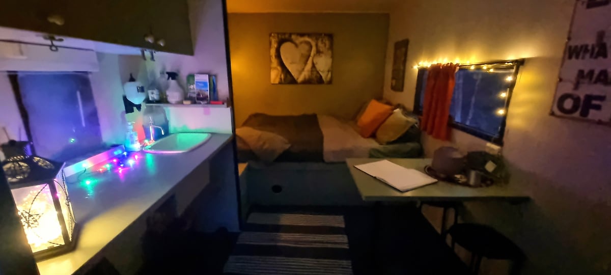 Liten hyttevogn med vedovn ved siden av en liten elv/bekk. Naturskjønt beliggenhet. Vogn har solcellepanel til lys og vedovn til oppvarming. Bålplass utenfor. Mulighet også å leie badestamp og tønnebadstue / sauna mot ekstra betaling. I sauna kan du vaske deg med varmt vann. Robåt til gratis lån. Plassen passer fint til dem som liker seg I naturen med enkel standard overnatting. I høst/ vintertid fra ca 15.9 - 1.5 er vogna sammen med eget privat ute-kjøkken. Hund tillatt