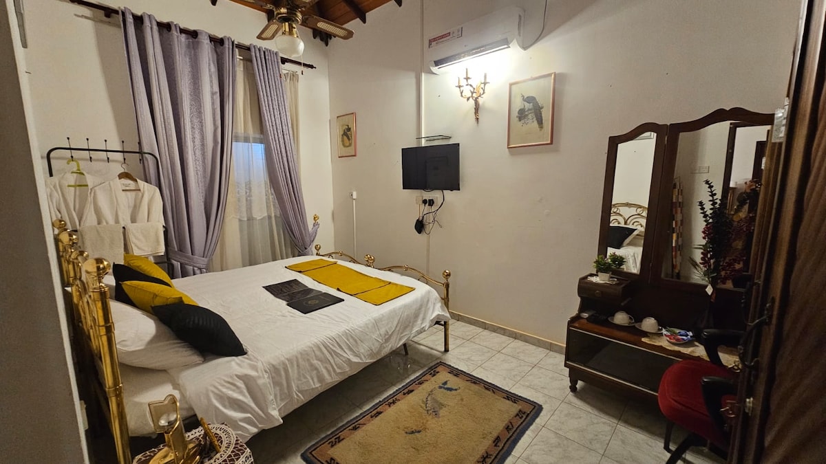 Casa de dos dormitorios con zona de jardín en un entorno tranquilo y pacífico. 2 camas dobles, aire acondicionado dividido, escritorio y armario de oficina. Cocina totalmente amueblada con refrigerador de dos puertas, gas de 4 quemadores y quemador eléctrico, horno microondas y cocina a presión. Sala de estar con sofá, TV LED de 42 pulgadas y aire acondicionado dividido. Mesa de comedor, apta para tres personas con dispensador de agua. Enorme área de jardín para el baño de sol matutino (área de 500 metros cuadrados) Hay estacionamiento gratuito dentro de las instalaciones.